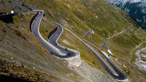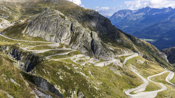 Scrambling up from Airolo to the St. Gotthard Pass, this road includes a spectacular, serpentine stretch which constitutes Switzerland’s longest road monument. Motorcyclists riding here can look forward to 4 extraordinary kilometres, an altitude change of 300 metres and 24 hairpin bends, each with its own name. It has many design features which make its appearance truly unique, having been left unchanged since work was completed in 1951. An intense and exceptionally panoramic route.