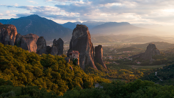 It starts at a classic Greek tourist destination: the Meteora columns of sandstone rock, the peaks of which are home to monasteries.