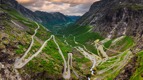 The Trollstigen begins in Langvatnet and ends in Åndalsnes. The highlight along the way is the UNESCO-protected Geirangerfjord, with spectacular waterfalls all around it. Rounding off the Troll’s Path are some spectacular landscapes and eleven breath-taking bends.