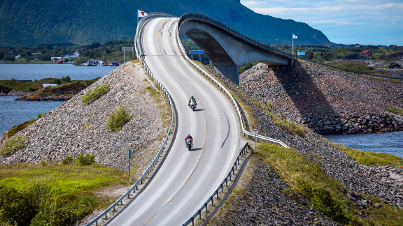 A true miracle of engineering, which took thirteen years of planning. We're talking about the road that connects the island of Averøy with the Romsdal Peninsula. Though less than 10 km long, every inch of the route is a guaranteed “wow”. This ribbon of asphalt is spooled out across multiple little islands, crossing 8 bridges (one of which is 260 m long). The weather is not one of its strong suits, and the beauty of the location is often tempered by extreme riding conditions. However, it’s worth it for the incredible view that unfolds before your eyes, including the optical illusion that makes half the Storseisundet cantilever bridge appear to disappear into the heavens.