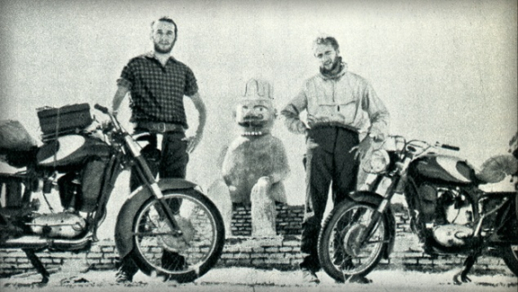 175cc. The two left in September 1957 and returned exactly one year later, having encountered a number of tribulations along the way, including surviving unharmed, four separate revolutions.