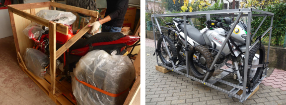 It goes without saying that the motorbike must be secured by disconnecting the battery and securing the spark plugs with tape, emptying the petrol from the tank (some companies permit you to leave a litre so that you can reach the first petrol station on arrival). What counts more, is that the shipping costs are determined not by the total weight, but rather by the volume of the crate it’s in.