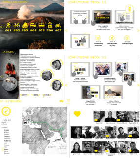 At this point the reader is ready to follow the story of the project and the seven trips, the latter being recognisable by the indication from # 01 to # 07 and by the means of transport used, stylized through the icons.