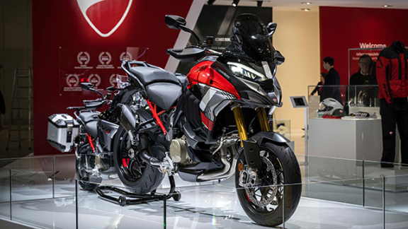 This Multistrada version’s technological features are truly complete. The above functions are complemented by: front and rear radar that dialogues with Adaptive Cruise Control (ACC), BSD (that signals the presence of vehicles in blind spots), FCW (warns the rider of a danger of collision with the preceding vehicle), and emergency Brake Light. To enhance the passenger’s comfort, Ducati has moved side cases and top cases back. Another prominent presence at the stand was the V4 Pikes Peak, with a sportier set-up, due to Online SmartEC suspensions and 17” wheels.