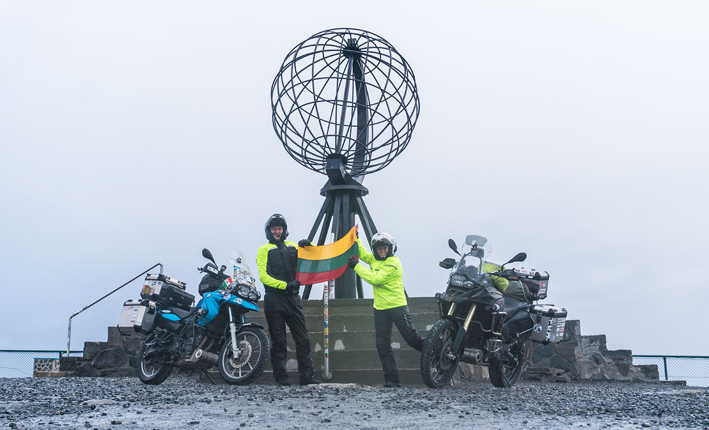 The Scandinavian country that we were most looking forward to was Norway. We even had a route planned for us by three Norwegian motorcycle travelers, so we couldn’t wait to get on it. And it sure did not disappoint us! Riding in the fjords, visiting islands, taking numerous ferry crossings in spectacular scenery was one of the best part of our European tour! The freedom to roam in Norway granted us the right to legally camp everywhere, so we pitched our tent in some really fantastic places! Local riders and the community of Lithuanian expats hosted us in several places along the way so we had a chance to see the beautiful life in Norway from up close. Finally, the last few days above the Arctic Circle were cold and rainy, but we made it – we reached the famous North Cape, or Nordkapp in Norwegian – the northernmost point of our journey. At 3 AM we arrived at the famous Globe monument. It was a good time as the sun doesn’t set at night so far North (in summer) and at night one doesn’t have to pay the expensive entrance fee to visit the monument, and most importantly, at night it is possible to get your motorcycle to the otherwise pedestrian area around the Globe for the picture.