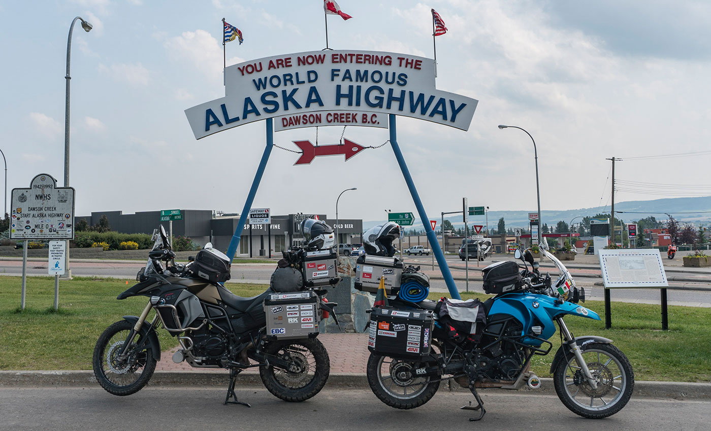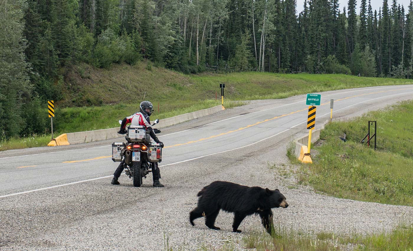 Canada immediately made it to the shortlist of our favorite countries. The scenic nature, wonderful infrastructure and so very friendly and, most importantly, rational people.After enjoying the famous Banff and Jasper national parks in the Rocky mountains of Canada, we took another week for visiting Asta’s relatives in Calgary and experiencing the yearly event that drives the whole city of Calgary crazy – The Calgary Stampede – a rodeo which happens for a week and creates the fun lively atmosphere of western style throughout every bar, restaurant, shop and even office building. Every type of public premises get decorated, people wear stylish cowboy hats, bars expand to fit hundreds of visitors in a festive mood and country music bands play all throughout the city all night long!Still with the rhythm of a country love song in our heads, feeling like two cowboys, we rode our iron horses into the horizon… and towards the beautiful province of British Columbia and onwards to the legendary Yukon as we were making our way to Alaska. The places grew more and more remote, the distances between towns expanded as we were riding the iconic AlCan Highway – the Canadian stretch of Alaskan highway. “Miles and miles of miles and miles” is the expression which describes that road best. And if not for something unusual to us happening on that road every day, it would have been a very long and lonesome ride… However, the sudden hail with the pieces of ice nearly the size of the golf ball falling from the sky (luckily, we found shelter for us as well as for motorcycles right on time…), the incredible amount of black bears as well as grizzlies roaming calmly around the road, the unexpected meetings with other travelers that we have known and some other every-day-adventures made those few days of riding the AlCan a lot of fun.