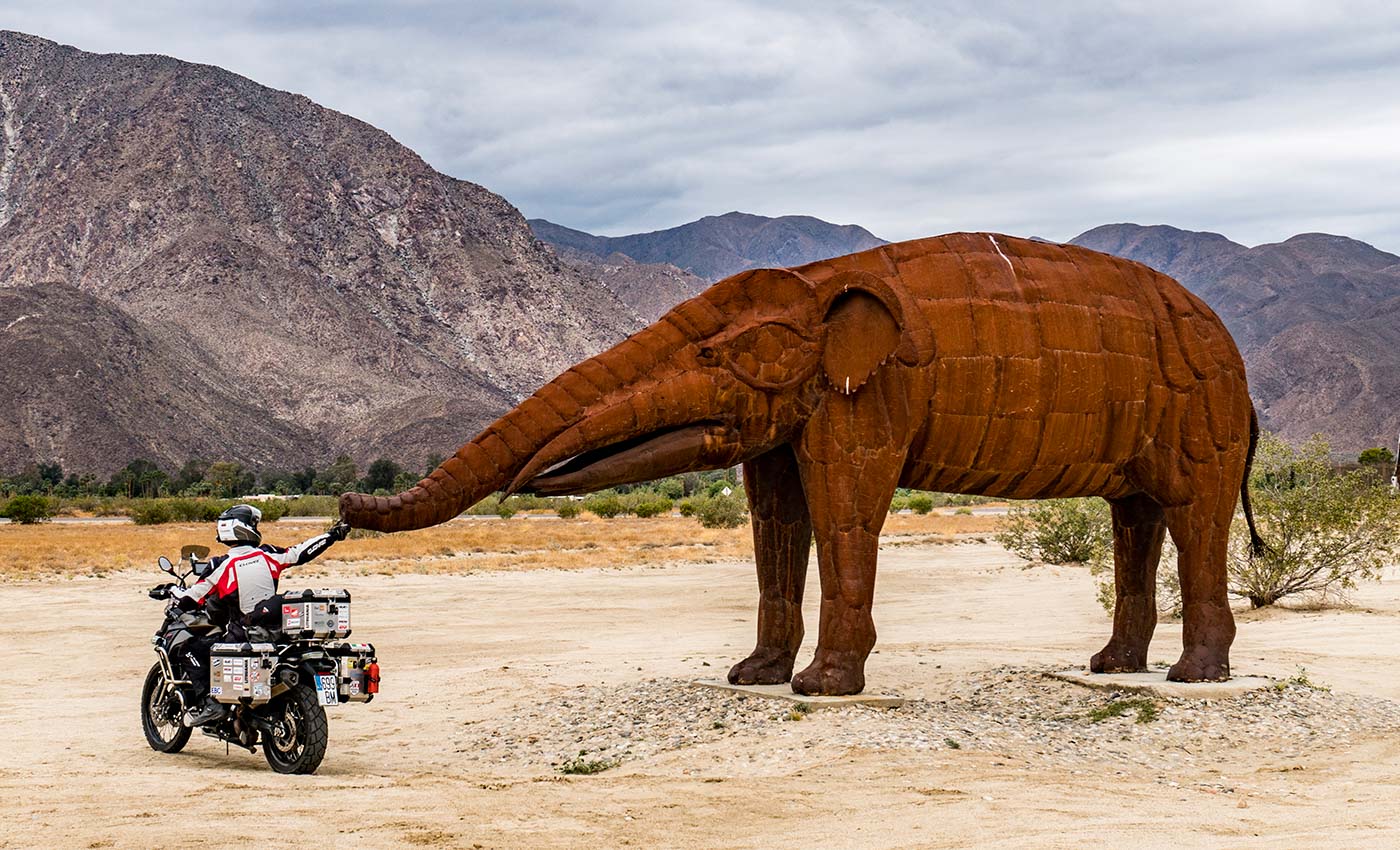 While still in Baja California, Mexico, we agreed to meet Daniel – a veteran traveler from the US, whom we first met in Colombia, later again in Guatemala and now we were invited to stay with him and his wife Teresa at their home in San Diego. Daniel offered to meet us in Rosarito, Mexico for breakfast and to escort us over the border to the US and we spent a beautiful morning sharing stories over the breakfast table and riding together with Daniel.We stayed for a week on the ocean coast in Southern California, doing some maintenance on the bikes and getting accustomed to the new country before we set off to Arizona, where, in the beginning of May, we were planning to attend the overlanders’ event Overland Expo West 2017.While visiting the impressive sculptures in the desert at Borrego Springs in California and taking a peak at “the fabulous Las Vegas” as it calls itself, we soon reached city of Flagstaff in Arizona, where travel enthusiasts from all over United States and beyond gathered together for a long weekend of the previously mentioned event, after which, together with a group of other travelers from US, The Netherlands, Germany and Canada, we went camping and sharing stories and memories from different parts of the world.