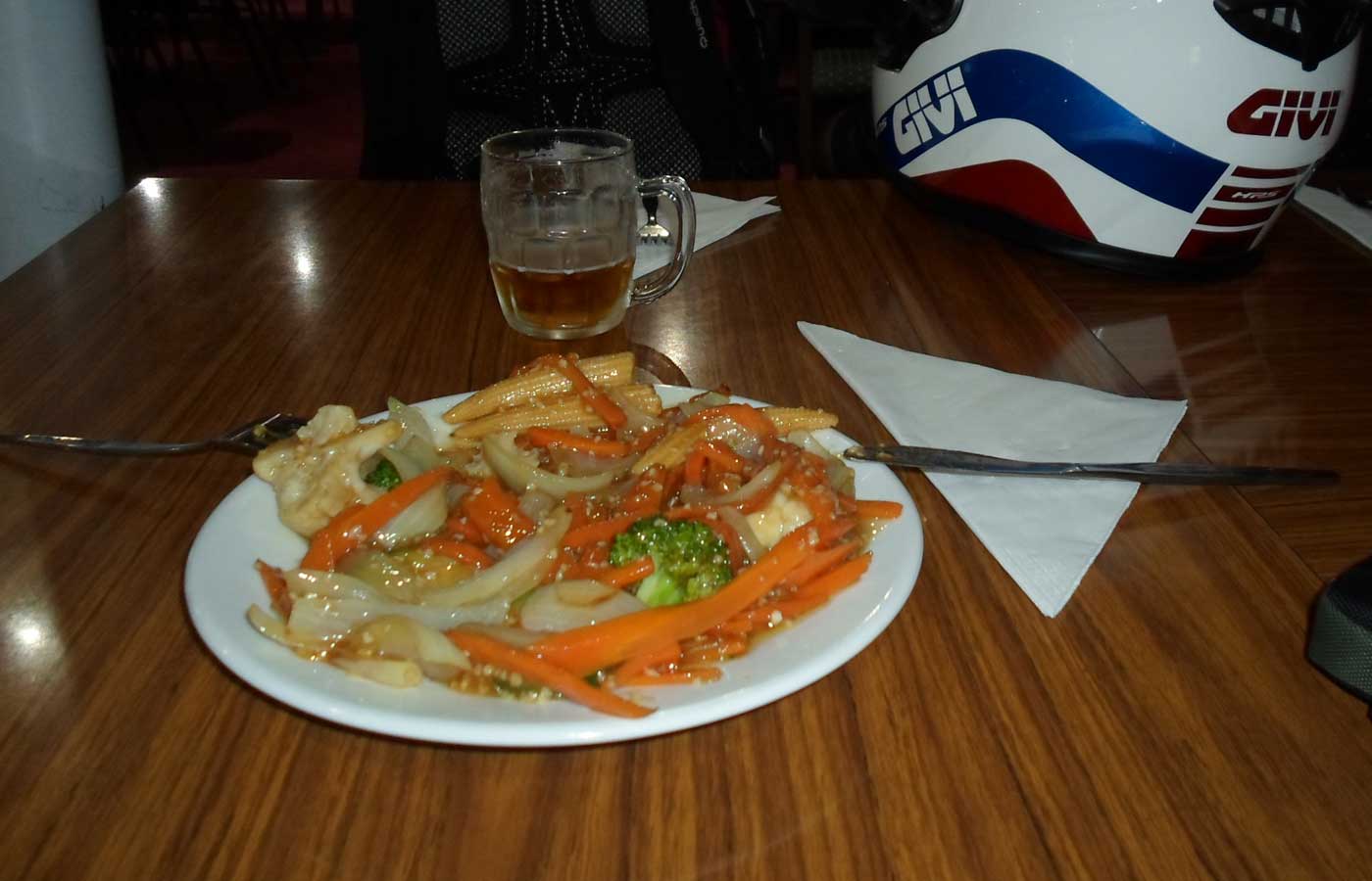 Clothing: jeans, comfortable waterproof goretex trekking boots, a very light cotton t-shirt or vest and on top a long-sleeved cotton shirt, cotton gloves, bandanna around my neck, double-visor full-face GIVI helmet. In my backpack: sweater, socks, tissues, two long- and two short-sleeved polos, another pair of gloves, shorts and a towel. In the practical Givi case: elastic straps to fix the petrol tank to the saddle, pouch with the battery chargers for the camera and the phone, torch, instant coffee, food and especially water.