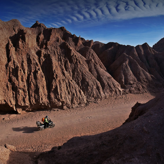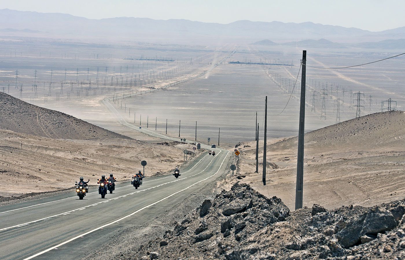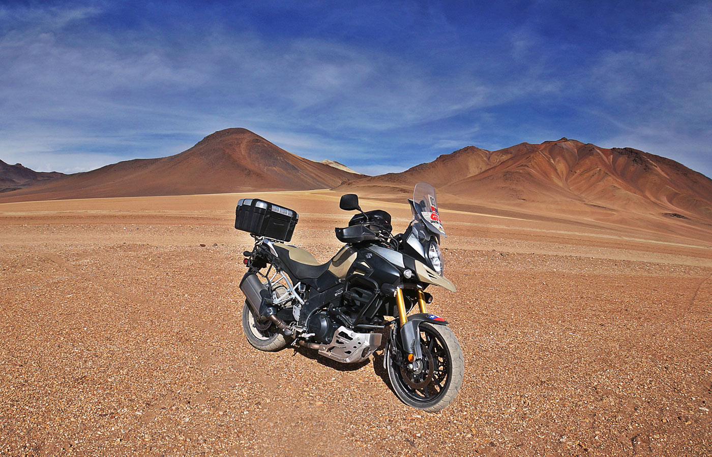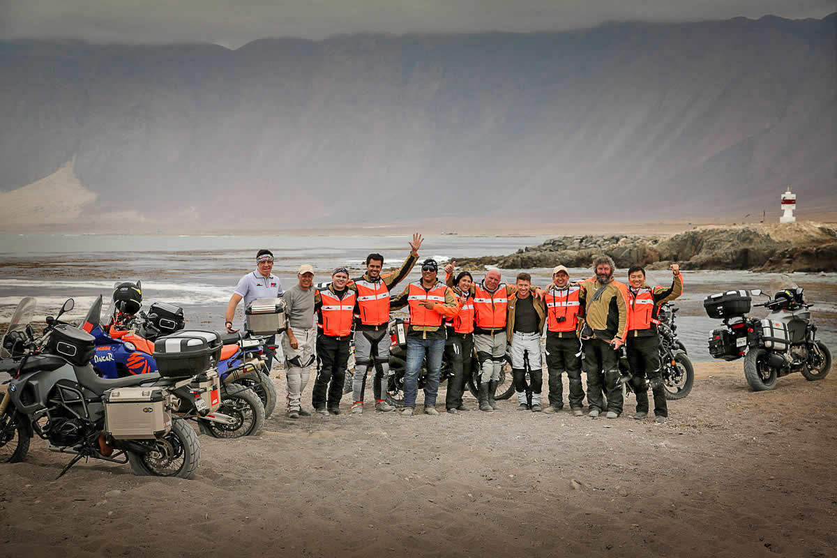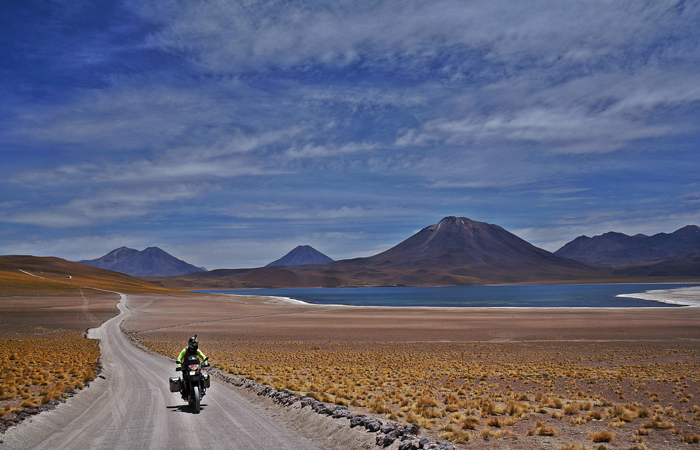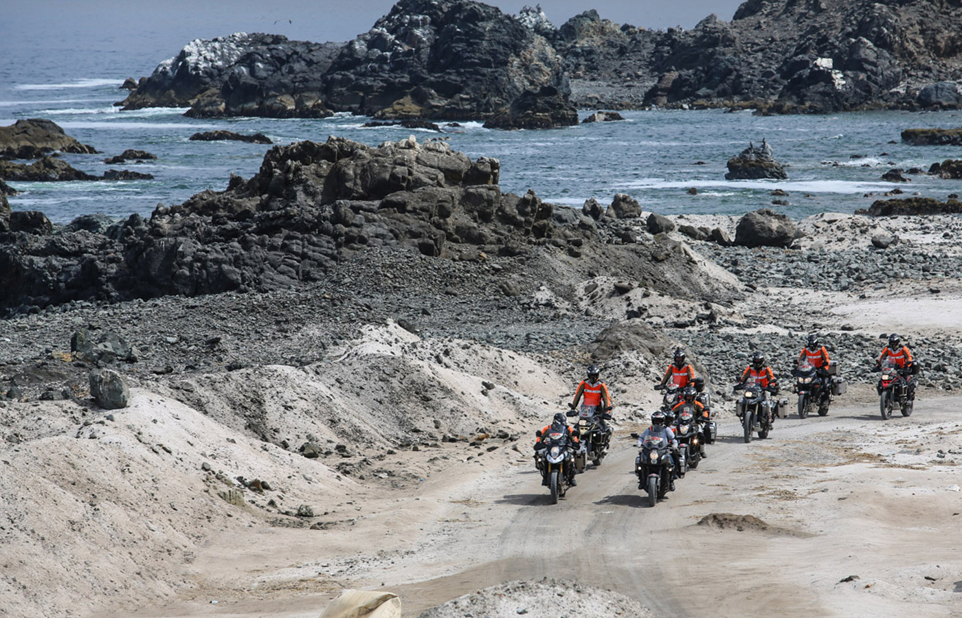 Curiosity, adventure and adrenaline fire us up on asphalt, dirt tracks, canyons and desert to ride 2,500 km in the wake of the Chilean stages of Dakar to the borders of Bolivia and Argentina. Jeremias Israel, a strong Chilean cross rider, extended an invitation: “Cross the Atacama desert during the Dakar race, so you can come over during the rest day in Iquique”. So we decided to live 7 days of extreme experiences, in stunning scenery, with beautiful passes many of which are unnamed, perhaps because they leave you quite literally speechless.From Calama, a city in the Atacama Desert, we travelled towards the Pacific Ocean until we reached Tocopilla, a town on the coast which was a welcome escape from the furnace of the desert. We followed the wild coast of the Pacific to the North up to Iquique, which has the lowest annual rainfall average, 8 times lower than that of the Sahara desert, famous for its high dunes that plunge nearly 1,000 metres into the ocean. We then rode through the Reserva Nacional Pampa del Tamarugal, populated by the Tamarugo trees, whose roots reach deep into the soil searching for water.Then we returned, riding along the coast and again we moved inland towards San Pedro de Atacama, about 170 km West from the border with Argentina and 60 km South from the border with Bolivia. We divided into two groups and we surrounded the panhandle of the Volcán Láscar, one of the most active volcanoes in the Andes, until we arrived at the Reserva Nacional Los Flamencos to see the pink flamingos. What an impressive landscape! The nature reserve is divided into 7 areas at different altitudes, from warm waters to salt lakes, to the Valle de la Luna… we drove to the area Laguna Miñiques, at the foot of the peak 6,000 metres high.