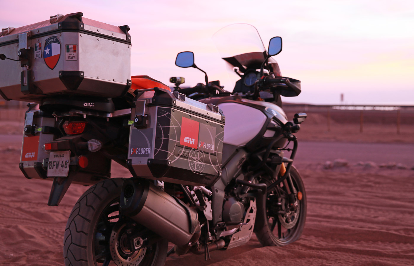 Our 11 motorcycles were fully equipped “to the nines” with GIVI cases and accessories. The 2,500 kilometer route in extreme conditions really put them to the test and they passed the test with flying colours. An extreme journey into the desert like our GIVI EXPLORER DAKAR requires bikes equipped with bags, spoilers, engine guards, additional headlights and other efficient and trustworthy “travel companions”.Lucio Cecchinello, who fully approved all the GIVI equipment for the motorcycles, had something more to add regarding the Trekker Outback Top Case and Side Cases. In addition to being valuable for the transport of personal luggage and other equipment, they also proved to be extraordinary for such extreme use: cold, heat, potholes, rain, sand, wind, dirt tracks, sand dunes, jumps and also… falls.Enrique Pernigon had particular praise for the strength and load capacity of the Outback Trekker Aluminium Top Case, which is capable of storing up to two modular helmets.The versatility of the Tanklock tank bags gave us great satisfaction. The GIVI patented Tanklock fitting system for rapid attachment provides safe and instantaneous attachment. The expandable bags with removable tablet holder are the ideal container for various electronic devices and much more.Among the many difficulties that we faced along the way, were the curves we encountered with bizarre trajectories and these were very deceptive while travelling at night. In these instances, the Additional Headlights were a marvel because they allow you to have a continually clear view of the kerbside.A serious Engine Guard is needed on tracks where there is a potential risk of falling. An Oil Carter Protector is also vital, particularly on stony tracks.What happens when the air becomes suddenly and violently hot? Near a town called Maria Elena, at 1,200 meters in the desert, we had to face a straight road cut by a red-hot wind. To protect ourselves from air and sand, there was the incredibly useful Windshield With Sliding Airflow Screen. It was particularly appreciated by Enrique Pernigon: thanks to its 2 piece format and its special aerodynamic effect. It provides excellent protection, thanks to its height, and when removing the sliding screen you can effectively ride along dirt tracks whilst maintaining visibility.Near the salt lakes and the magnificent lagoon, the Side Stand Extension stopped our bikes from sinking into the muddy sand.In Chile the considerable distances between one settlement and the next can create many problems. After Tacopilla, for example, the next refueling stop was almost 139 km away with no villages, no houses and no fuel in between. Essential items were the Jerry Can Holders and Jerry Cans. which were filled before the trip!To see the Dakar riders, at 5am Ciaccia and Ambrosioni left dressed as for the Elefantrekken: they needed an extreme Winter outfit to ride to a 4,300 m pass. The Hand Protectors did their job, and for that they earned a score of 10/10.“As always the GIVI CASES AND ACCESSORIES – that I use in all my motorcycle trips – have perfectly met the requirements, protecting my equipment from the heat, dust and torture of long stretches on off-road paths.” As stated by the photographer, Pietro Ambrosioni.