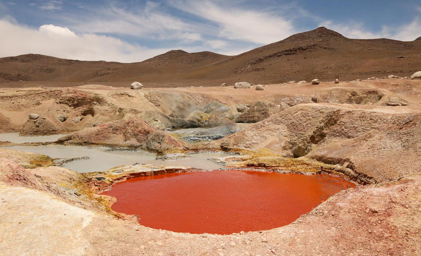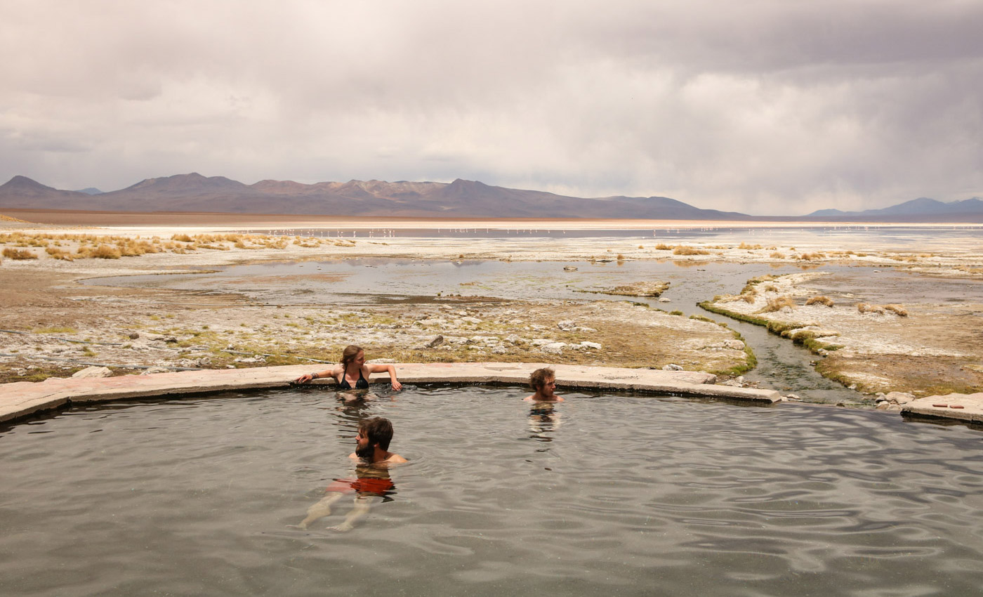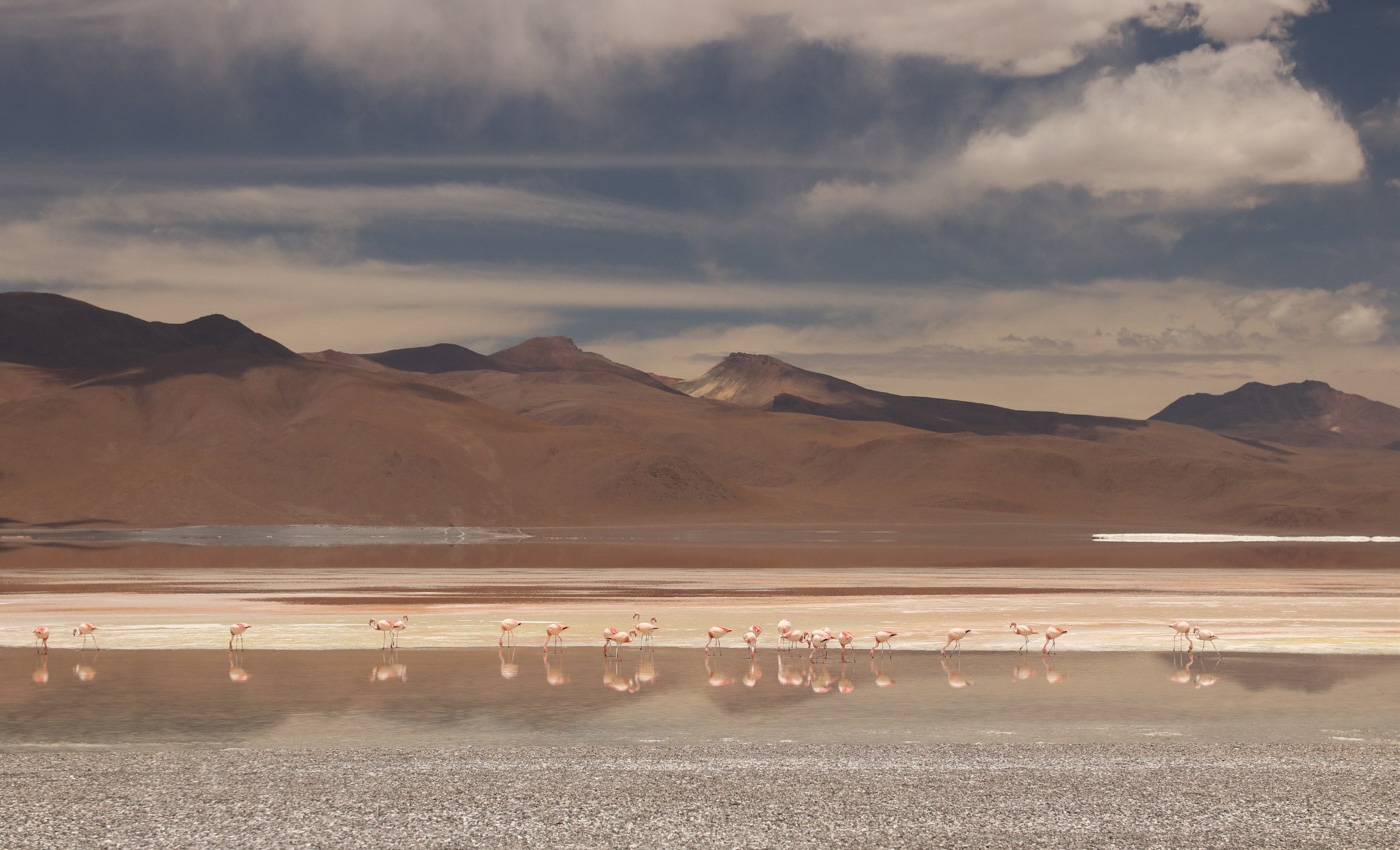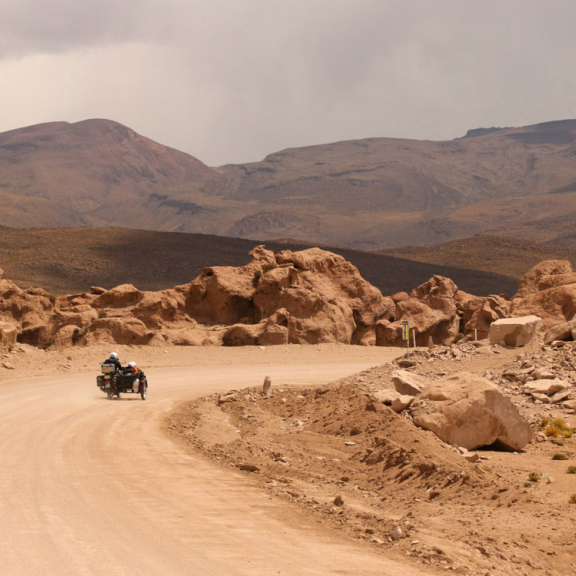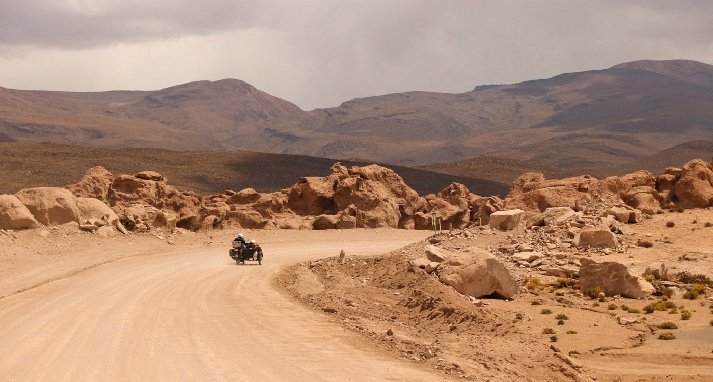 Then, we have decided to go with a guide by 4×4 in the South of Lipez, an area in the South of Bolivia. The roads are in very bad conditions and we preferred to give a rest to our side-cars. The area is absolutely glorious. We saw the Laguna Colorada, a lagoon with a tint of red and many pink flamingos, the Geysers, the Aguas Calientes with a bath at 35°C and a view over a lagoon, the Dali Desert which looks like one of the paintings of the famous artist and the Laguna Verde, a lagoon with a tint of green. After this we crossed 200kms of desert to reach the Peruvian border, in Ollague.