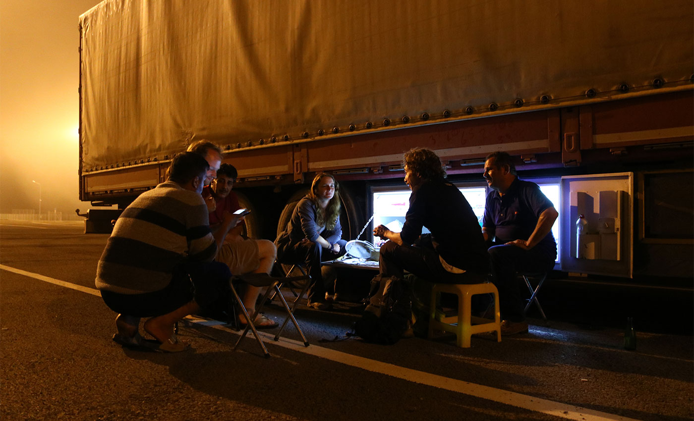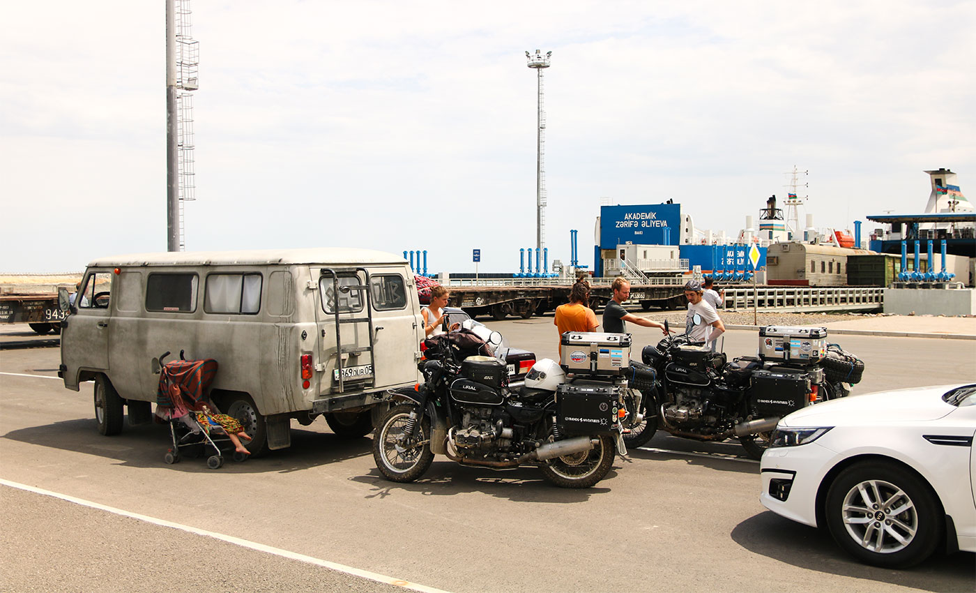 Once backed in Aktau, we learn there is a ferry on the next Wednesday. We are able to buy the tickets at the end of the afternoon on the Tuesday ($80 per person for a cabin). However, we learn at this moment that we need to go straight to the port to register our vehicles. Located 100 kms further towards South, we arrive at the port of Kuryk at dusk. We start the paperwork to register our vehicles. We need to pay a few fees (20€ per sidecar) plus showing our passports, vehicle document and the temporary import document when we entered Russia. After a short night, we go through some other paperwork and board on the ferry in the middle of the afternoon. On board, we got a stamp on our passport for going out of Kazakhstan by a custom officer. The crossing by ferry lasts about 20 hours and is the perfect opportunity to meet many other travellers.