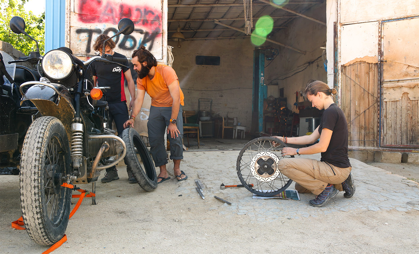 On the way, we pass by Beyneu, where we meet Leha. He is a hostel’s owner who likes welcoming and helping bikers. We take the opportunity to use his workshop to change a worn tire. After Beyneu, the relief is changing. There are more mountains and valleys.