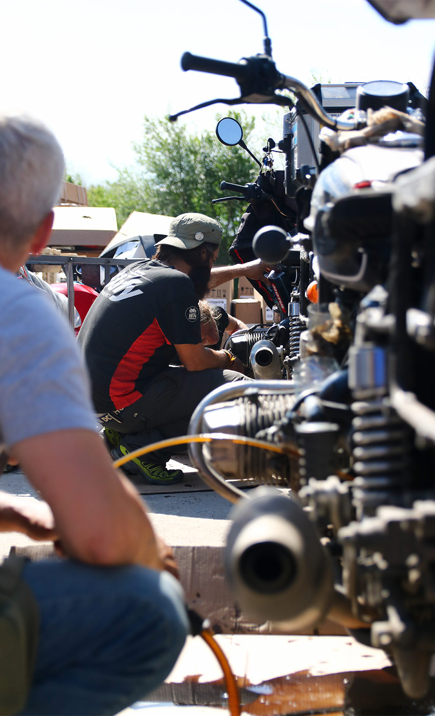 Once arrived in Uralsk, we start by collecting our engine oil ordered for us by the Motokrug56 shop of Orenburg in Russia. The engine oil shop kindly requests to the moto club of the city, “Chingizkhan”, to come over for meeting us and helping us with any enquiries we may have. They are actually very helpful plus it’s also the opportunity to share a few evenings with them with local specialities such as the “beshbarmak”, a pasta and horse meat speciality cooked only for the big celebrations.
