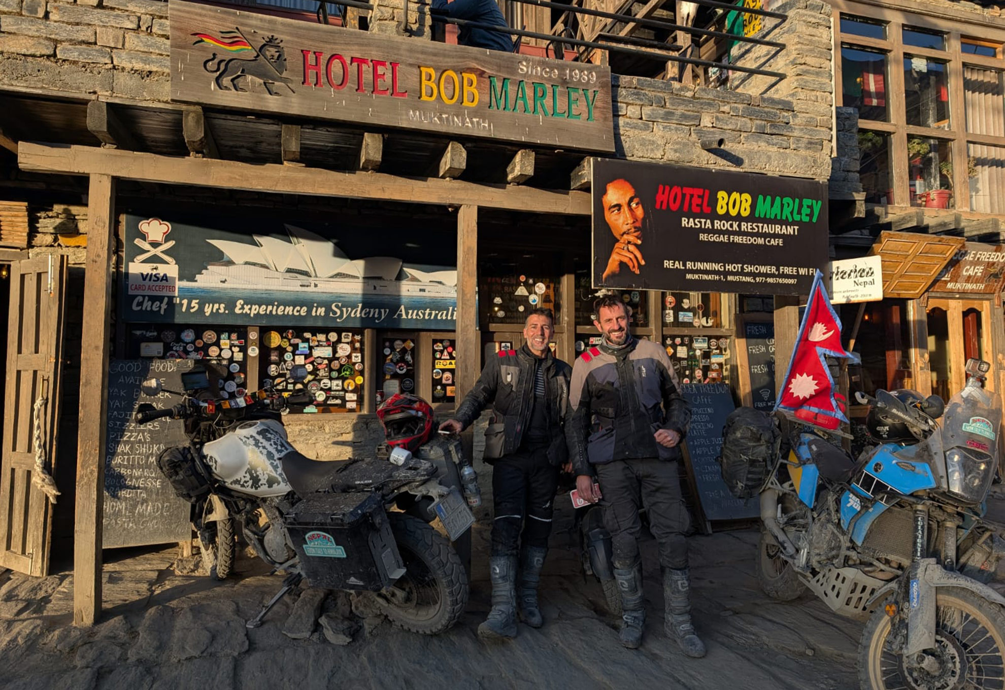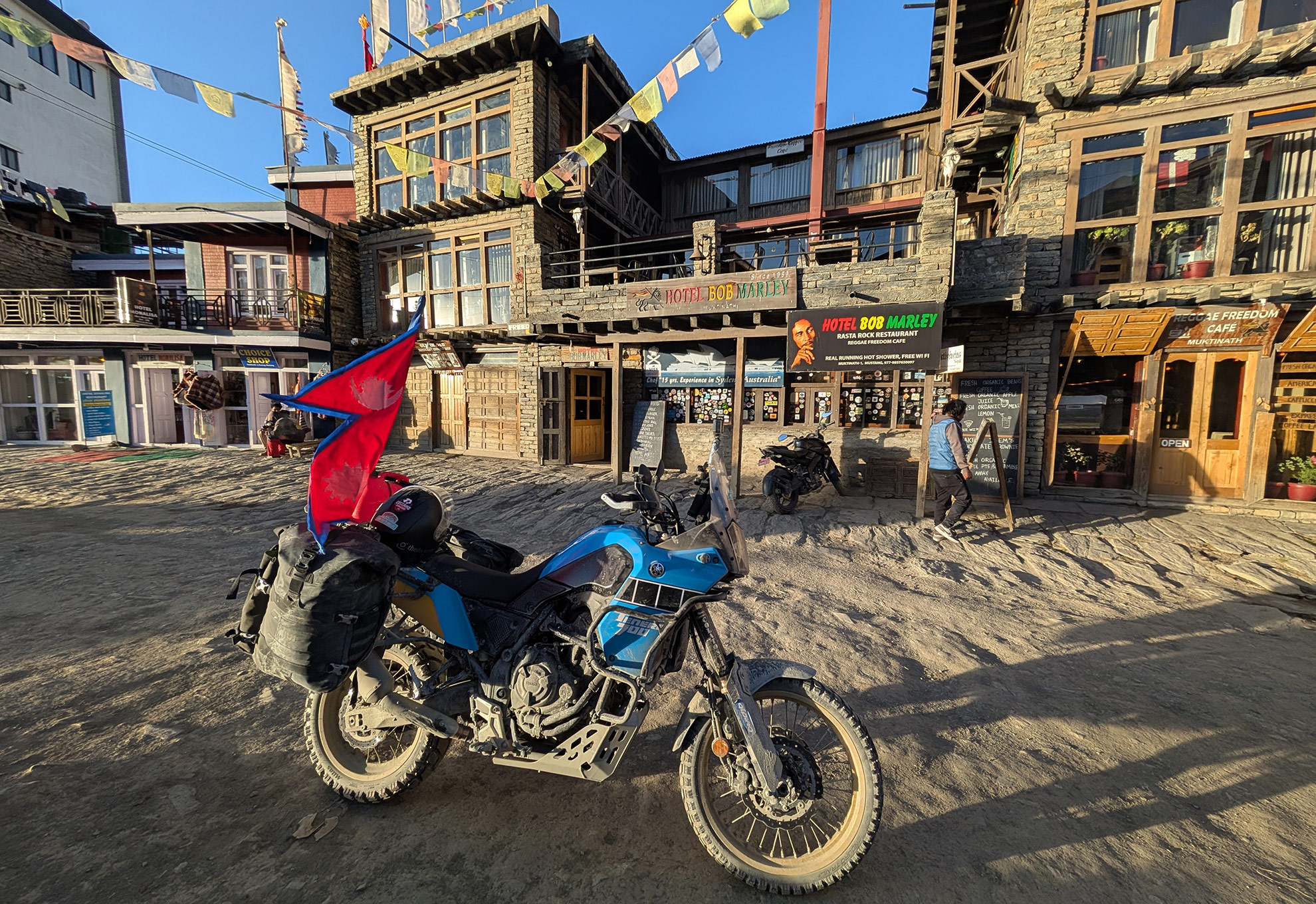 The village seemed deserted: closed hotels, a few horses and flags. Eventually we found somewhere that was open: the Bob Marley Hotel. We had landed, our destination within the destination. Getting off the motorcycle was a moment full of joy and adrenalin: the Himalayas were ours.