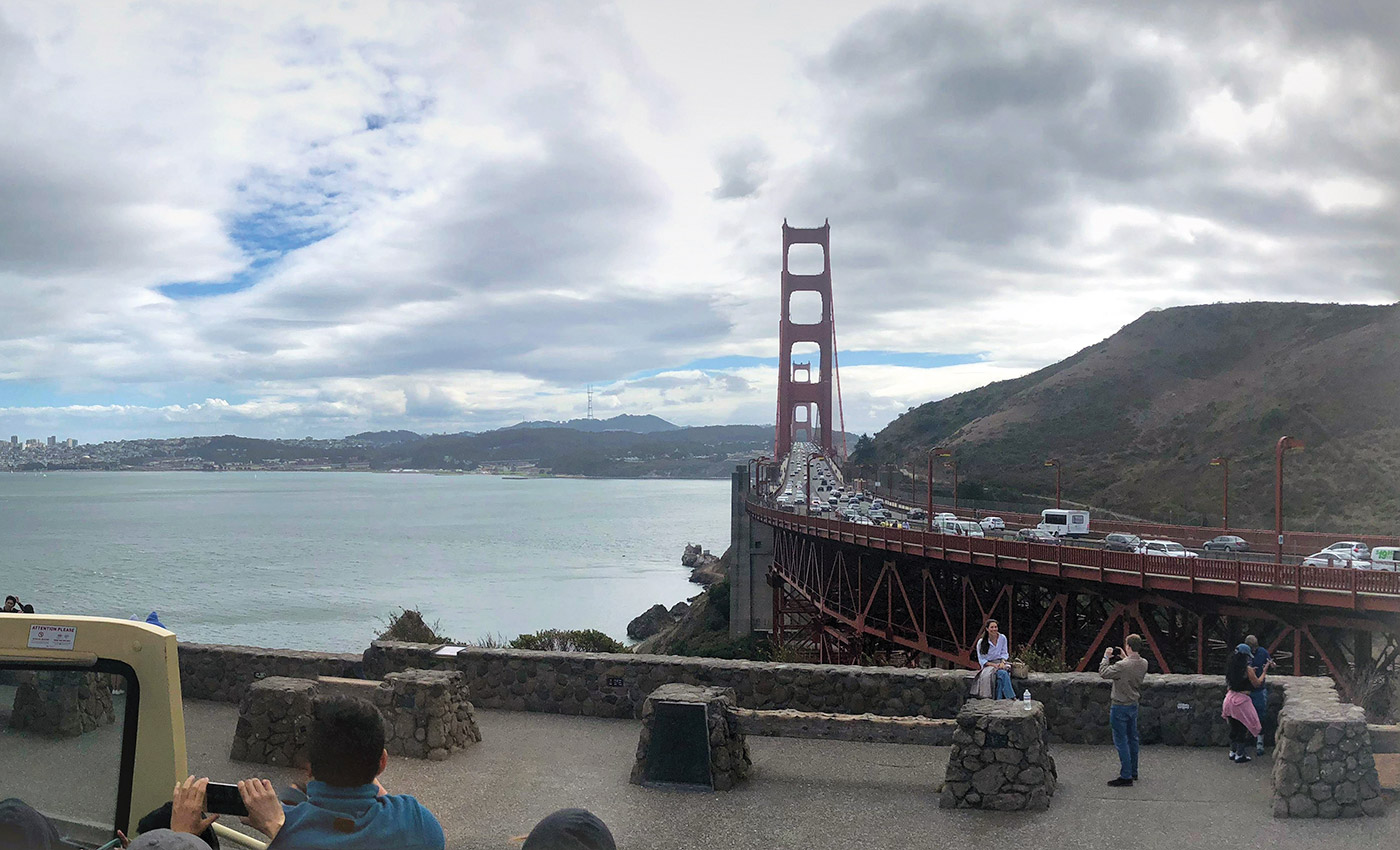 I decide to go back to the places I visited the day before, this time on my bike; one must see: The Golden Gate Bridge which, with its famous red spans, overlooks the bay of San Francisco. The bridge, seen from the vantage point I have chosen, contrasts with the landscape, standing out to such an extent that you can easily understand why it has become the symbol of the city.