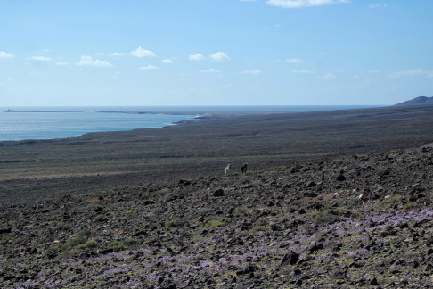 We start again and it is already late afternoon. The return is exhausting as for every single inch of road the strong wind jerks the bike to the right and left, I try to curl up a little, but it does not have much of an effect as Aeolus is far too strong. The following morning, I wake up to the same strong wind that wore me out the day before. Damn! This time we want to visit the interior of the island and the other side of the coast, so we begin from Aguas Verdes. We continue riding to the middle of the island where the road runs along the highest peaks of Fuerteventura.