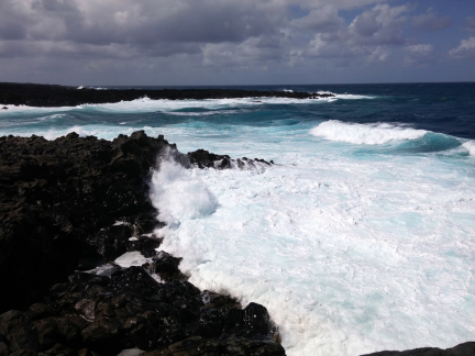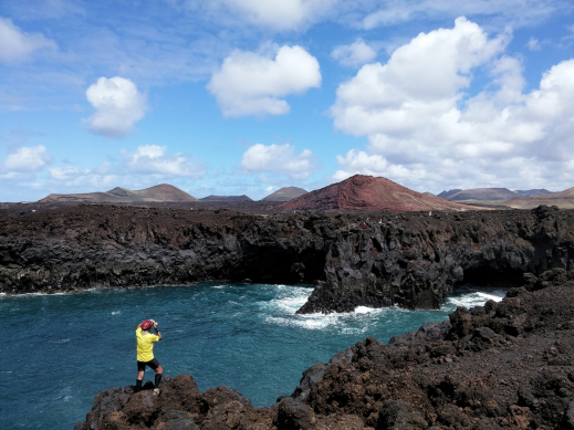 Back towards the south, we follow the lava path to the ocean. We continue riding to El Golfo. Then we reach Los Hervideros, a large parking lot full of people. We get off the motorbike and follow a path which is above the parking area and there we stand astonished!