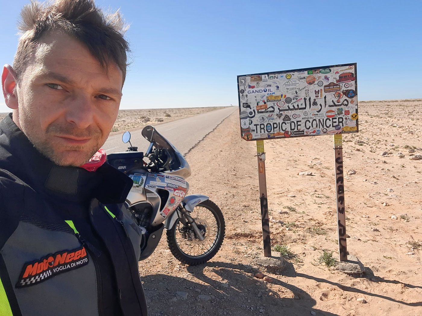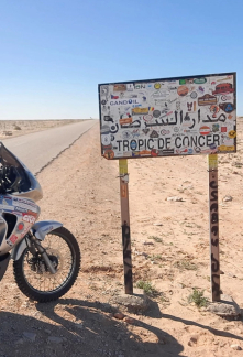 The total stretch was 430 km on wild road, with petrol stations few and far between, an entirely desert environment and the symbol of this Trans-Saharan journey was the sign for the Tropic of Cancer, just before the town of Guerguerat.