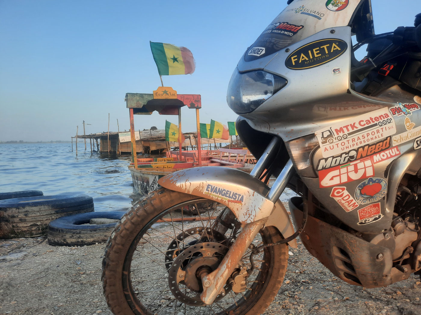 I reached the capital and slept in a beautiful, inexpensive camp. On 9 January, another exciting leg of 265 km on wild road, where I tackled 60 km of dirt track to reach the Senegal border and the next city of Saint-Louis. I sped through that stretch fuelled by adrenaline, and I say sped because Senegal’s border closed at 18:00 and I didn’t know how long they would keep me at the Mauritanian border for the exit bureaucracies. My pace past Diama was 90 km/h and believe me when I say that if my frames or top case didn’t break, and I didn’t lose my luggage, it’s only because GIVI’s products are the BEST and most resistant on the market. After this test, I’m even more convinced of this! After spending the night in Saint-Louis, on 10 January I finally set out for Dakar. But first, an unmissable stop at Lake Retba, the pink lake.