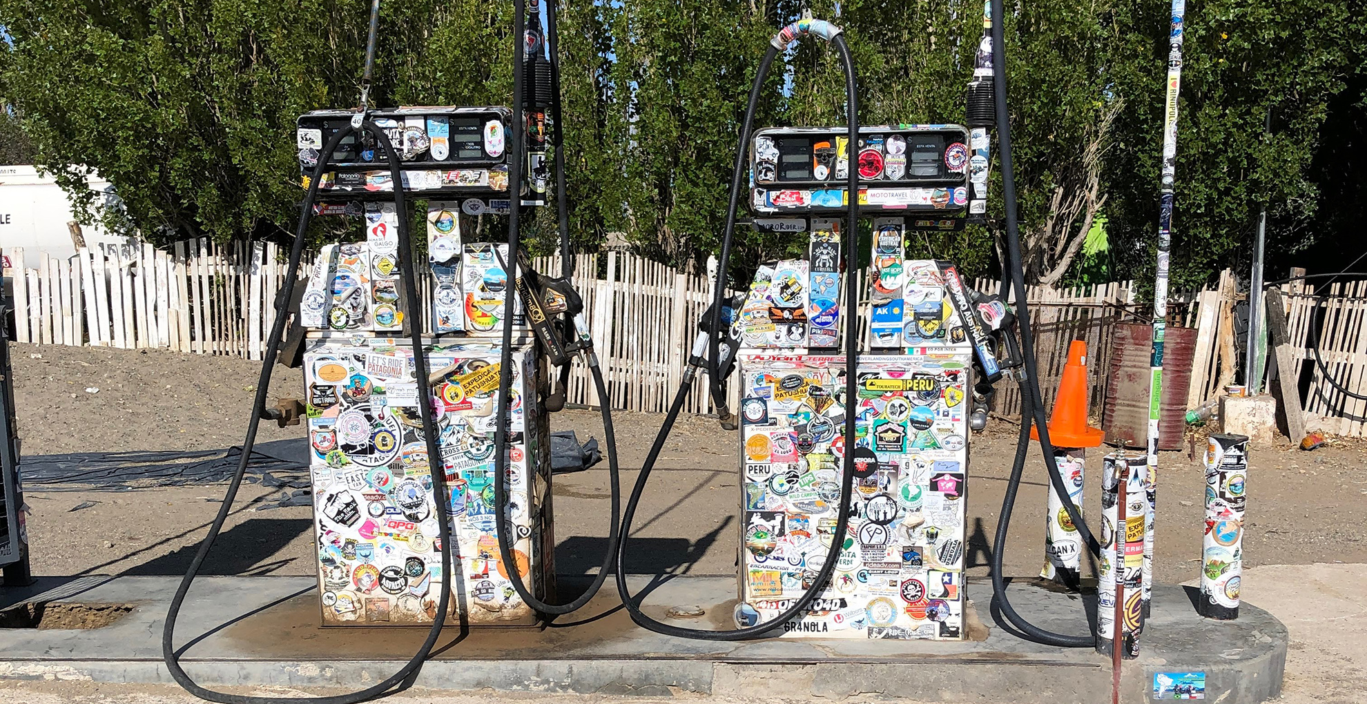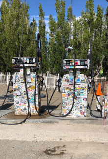 We entered Argentina full of excitement, and just a few minutes later found ourselves skirting Lake Buenos Aires. That’s right: it’s the same lake, with a different name on each side of the border. Continuing south, we came to Bajo Caracoles. The petrol station in this little village is an essential stopping point, given that the nearest town is too far away to reach without refuelling. Many of you will have seen a photo or two of this site, where all passers-by leave a sticker behind.