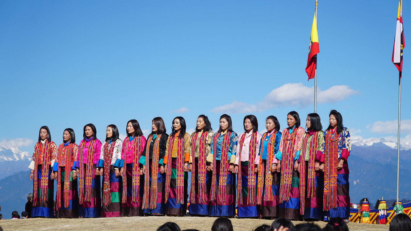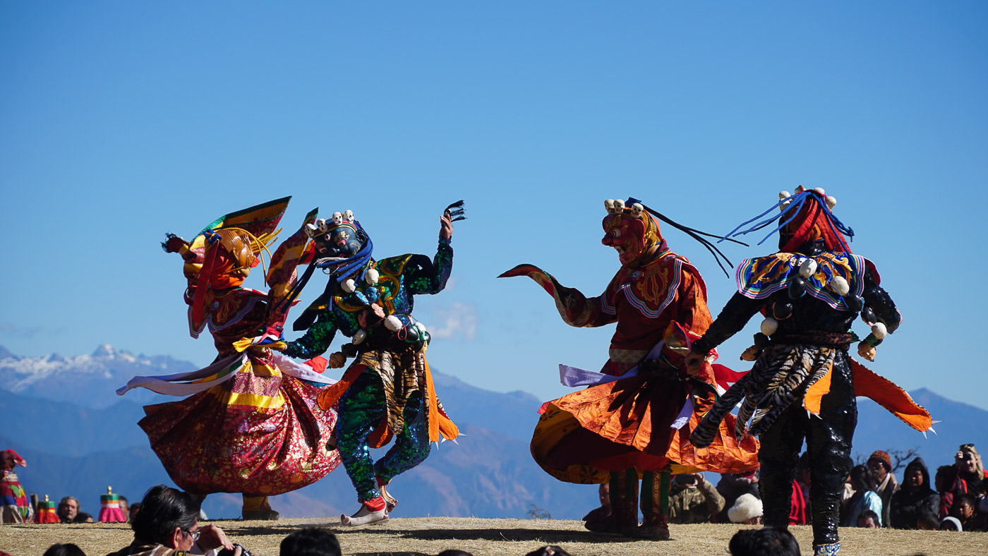 We were also lucky to visit the Druk Wangyel festival, that takes place once a year at Dochula pass. Soldiers of the Royal Bhutan Army are performing masked dances. It honors the King but also celebrates the efforts to protect the sovereignty of the country. Seeing the masked people dancing to mystical drum music in front of the spectacular mountain ranges was truly amazing. Bhutanese families sat in the grass enjoying the view.