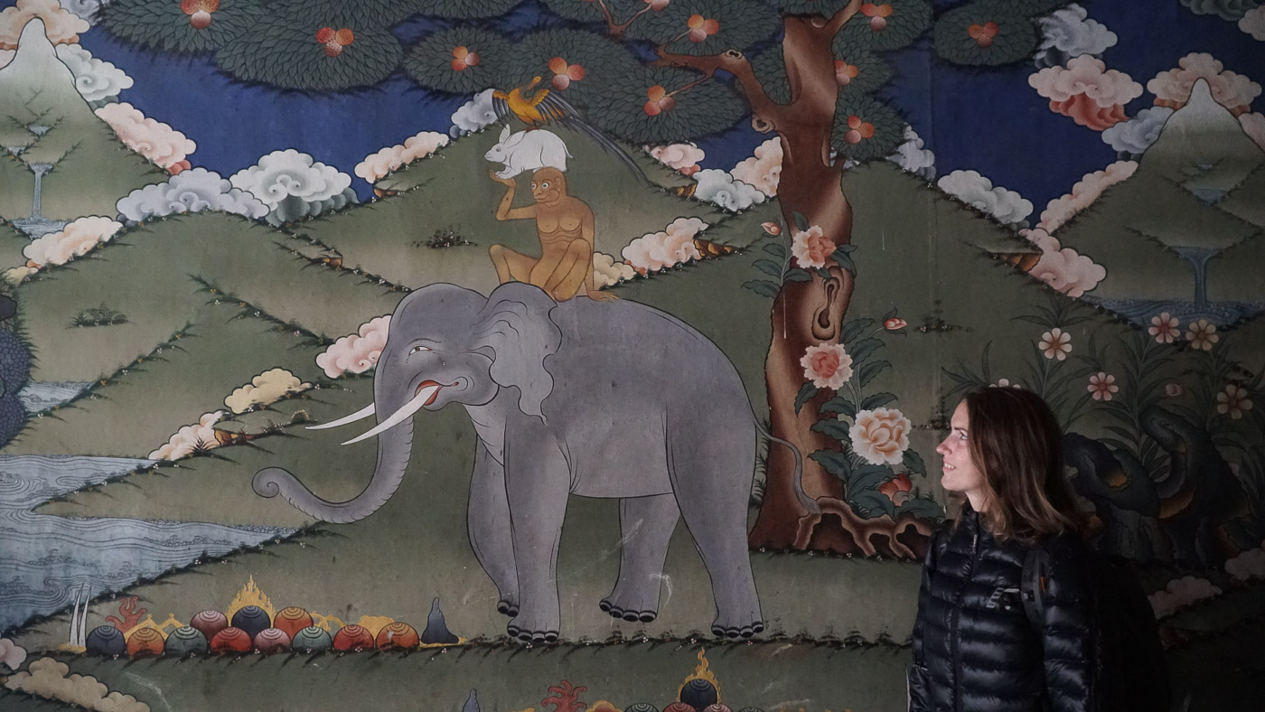 One of the many beautiful wall paintings told the story of the four harmonious animals. An elephant, a monkey, a rabbit and a bird are standing on top of each other. This common theme is about respecting each other regardless size and age.