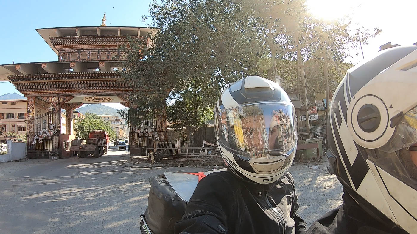 Waking up early in the morning in Jaigaon, a typical Indian border town with lots of crazy traffic, we first had to officially exit India before entering Bhutan. We soon found the immigration office where we got the exit stamps in our passports. To officially export our motorcycle, we also had to visit the customs office. Due to the Indian traffic where cars, cows, tuk tuks and cars all stand on the road making as much sound as possible, it took us longer than expected to reach the nearby customs office. Once we got our carnet de passage stamped, we were ready to enter Bhutan.