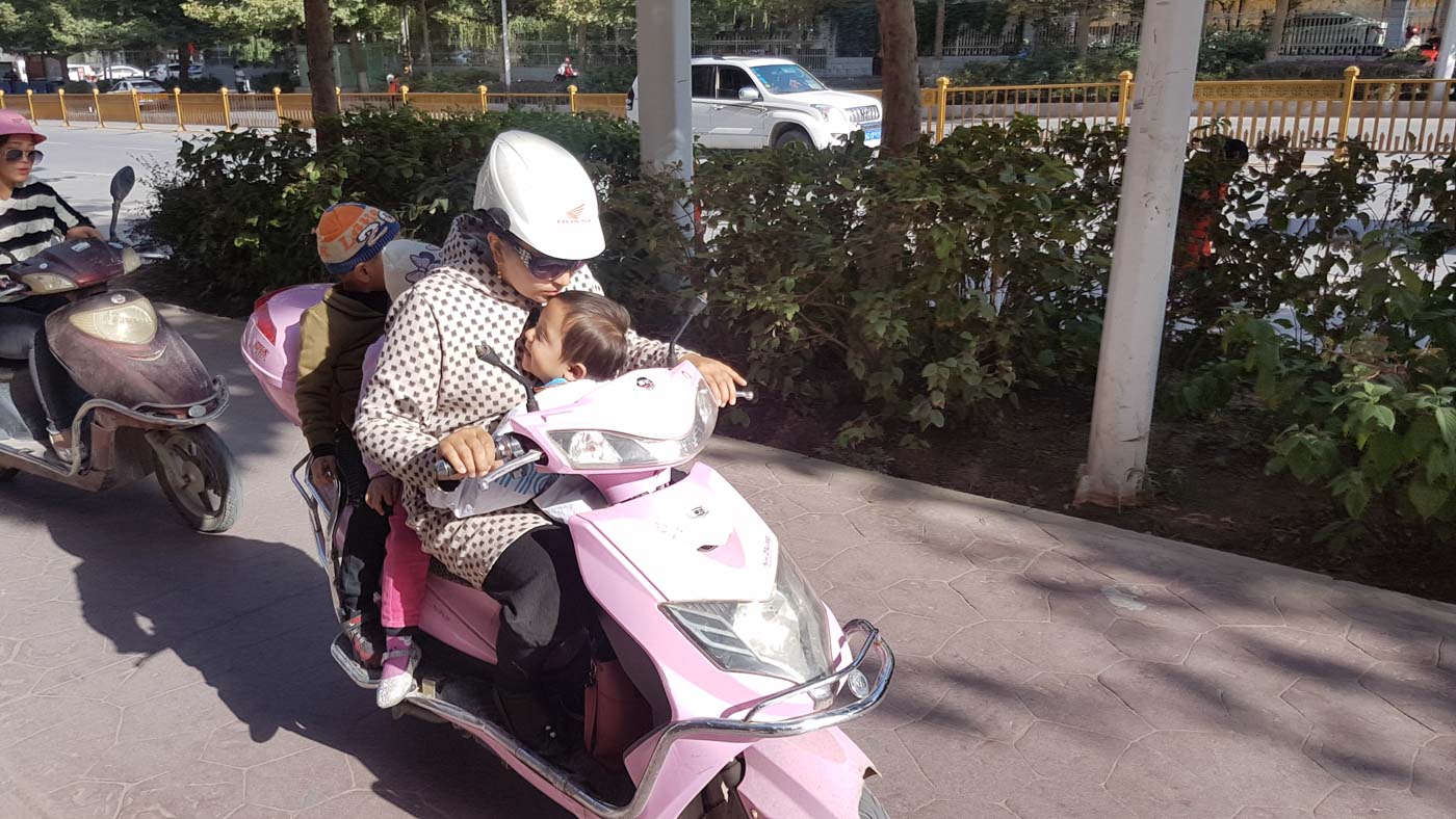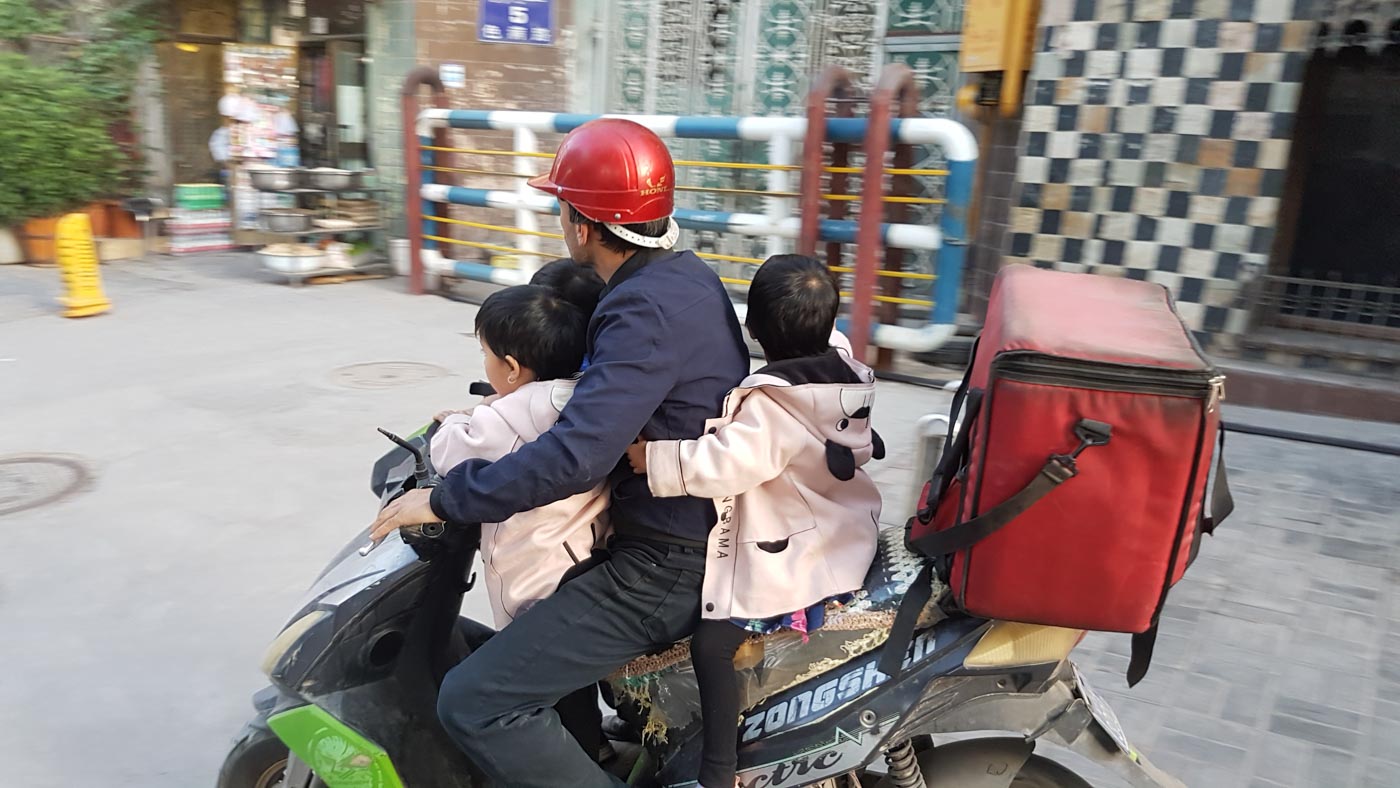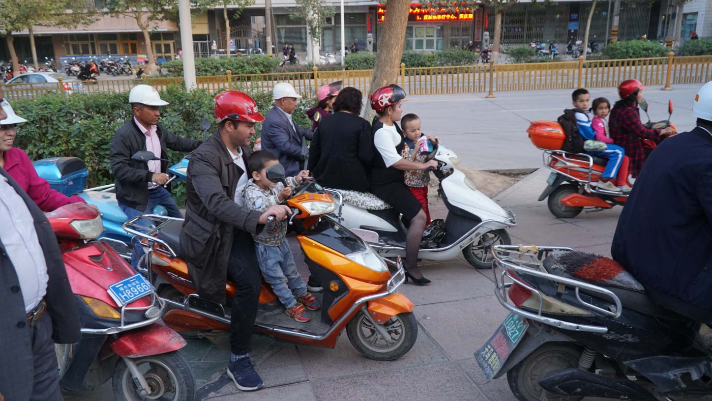 Outside the building Abdul told us to leave the motorbike there for the night and continue tomorrow. There were still many things to do like getting a Chinese number plate and a Chinese driving license. We were allowed to put some stuff for the night in our bags. On our way to Kashgar we had to stop for another passport control. Hundreds of electric scooters were driving on the streets. They had a whole lane just for themselves.