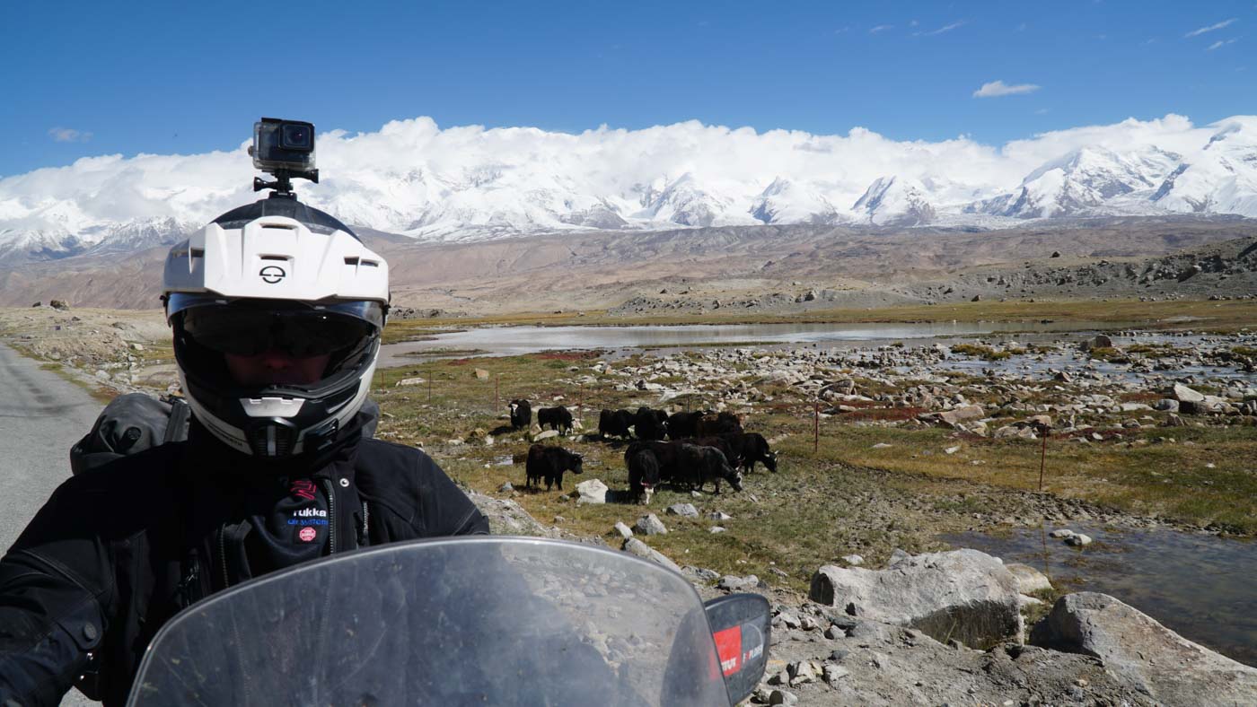 First we had to exit Kyrgyzstan. Normally we just showed our passports, got an exit stamp and were free to go. On the border to China that was not the case. Before the official exit point there were two different military checkpoints where we had to show our Chinese visa and had to open our bags. This took quite a long time and required some patience. On the last checkpoint one officer even wanted to keep our small helmet camera although we didn`t even use it. He saw us packing away the GoPro, snatched it, put it in his pocket and told us to drive on. He would check our video material later. We protested vehemently and Peter ran after him immediately loudly involving other officials. In the end we showed them the videos on the camera. As they didn`t find anything incriminating we were allowed to go on with our camera.