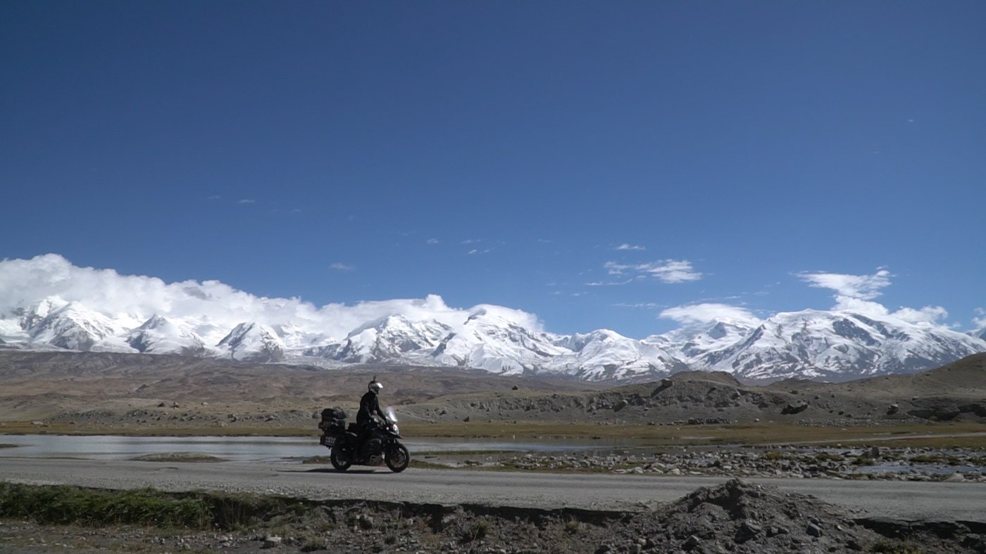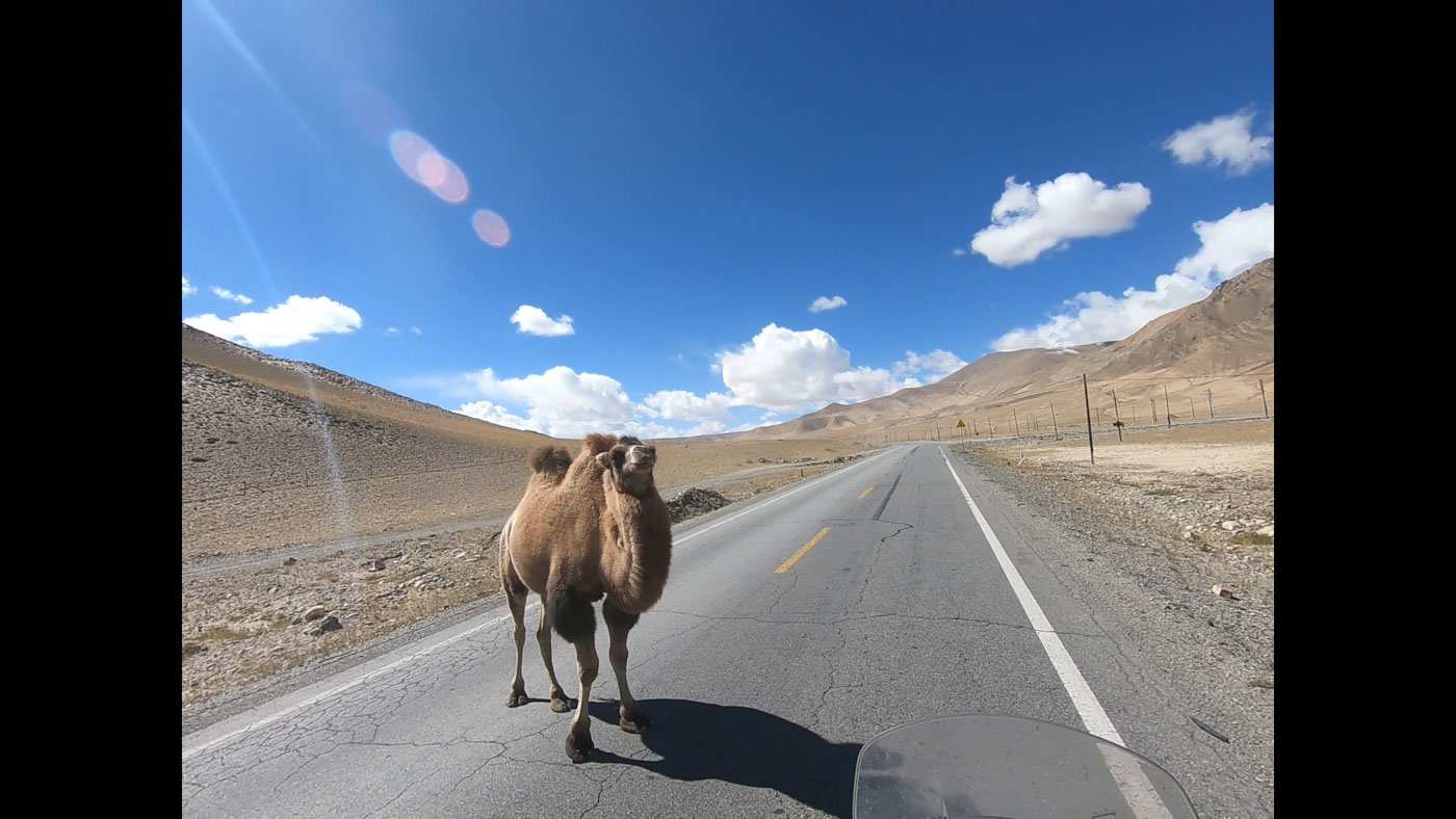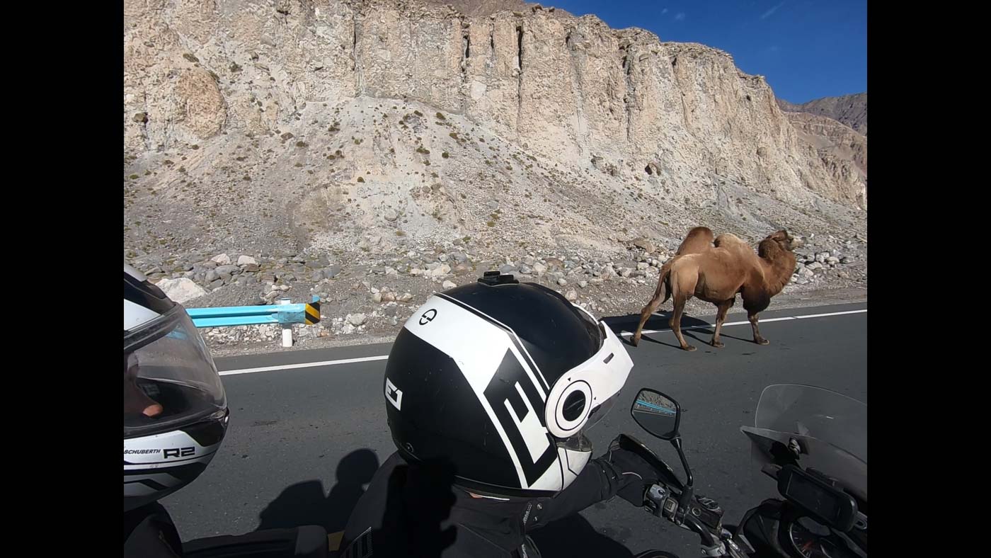 We quickly got on the bike, said goodbye to Gerhard, who wished us all the best, and drove behind our guide`s car. After a few minutes we had to stop at a police control. There were cameras everywhere, countless policemen, SWAT units and even a man with a machine gun standing above. When we were finished with passport controls our guide told us that the speed limit for 60 kilometers per hour wouldn`t apply for foreigners so we should drive as fast as we can. He would meet us in Tashkurgan as soon as possible at the petrol station. We did as we were told and started riding on the Karakoram Highway towards Tashkurgan very fast. The scenery was fantastic and we regretted not having more times to take some pictures. There were glittering blue lakes and very high snowy mountains everywhere. We even saw camels walking on the road.