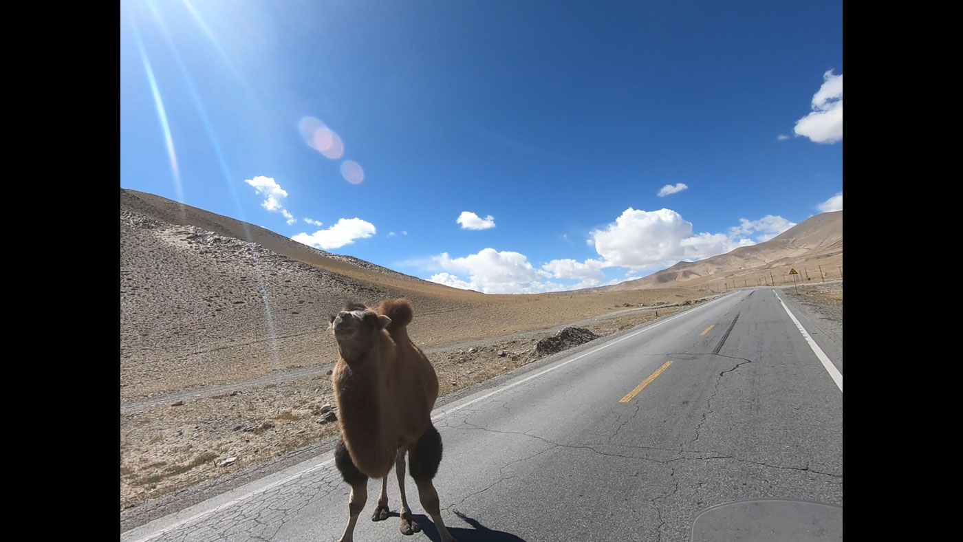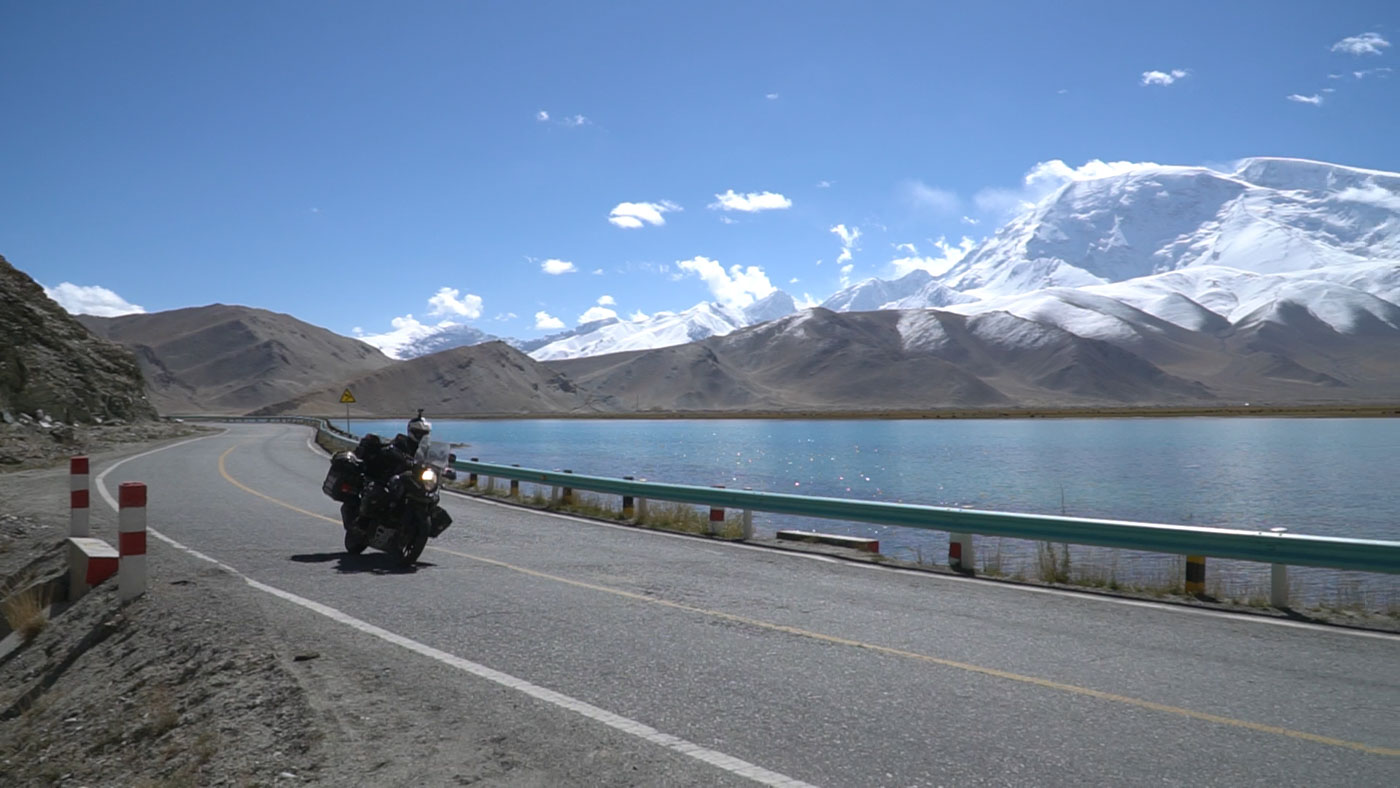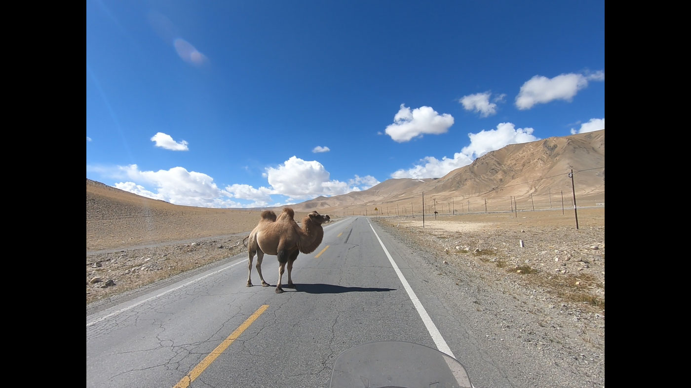 We quickly got on the bike, said goodbye to Gerhard, who wished us all the best, and drove behind our guide`s car. After a few minutes we had to stop at a police control. There were cameras everywhere, countless policemen, SWAT units and even a man with a machine gun standing above. When we were finished with passport controls our guide told us that the speed limit for 60 kilometers per hour wouldn`t apply for foreigners so we should drive as fast as we can. He would meet us in Tashkurgan as soon as possible at the petrol station. We did as we were told and started riding on the Karakoram Highway towards Tashkurgan very fast. The scenery was fantastic and we regretted not having more times to take some pictures. There were glittering blue lakes and very high snowy mountains everywhere. We even saw camels walking on the road.