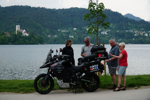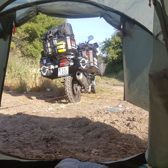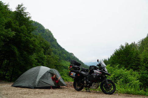 As it was already evening our first stop was shortly behind the Slovenian border near Bled, where we put up our tent. On the next day we woke up to a mountainous scenery and after having a good breakfast out of our Givi backpack with Austrian bread, cheese, vegetables and fruits we decided to visit lake Bled. When we went on curvy roads downhill we caught a glimpse of the turquois blue lake glittering in the sunlight. We can only recommend every motorcyclist to visit lake Bled in Slovenia once. We spent the rest of the day relaxing near the beautiful lake, trying to get used to our new way of life. For the night we found a secluded spot in the fields between some trees. After some travel experience we have preferences where to put up our tent to sleep in the wilderness. At first, we get off the main street and then try to find some field where we can pitch our tent unseen from other people.