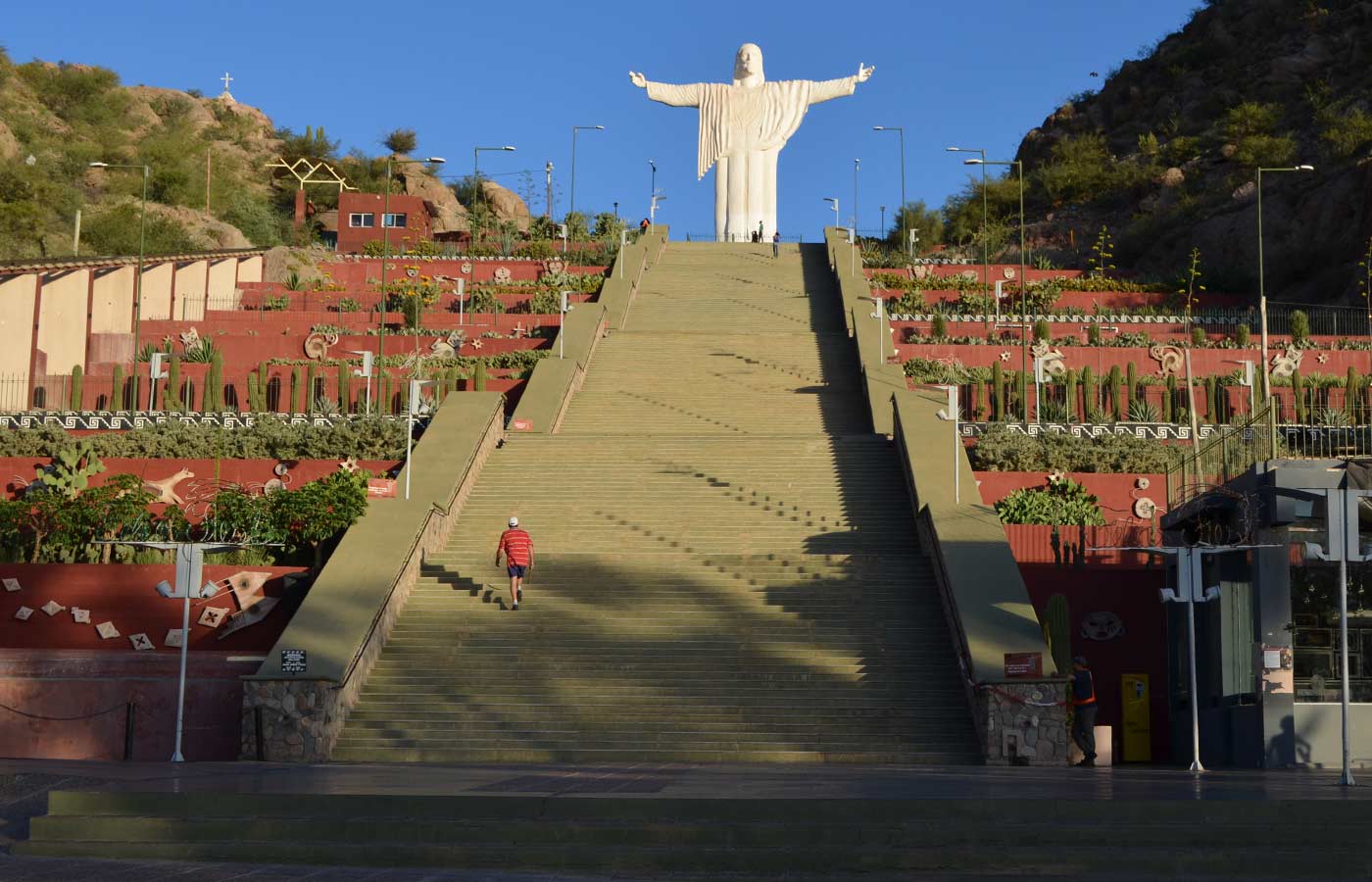 we do the Coronel Felipe Vanera road, a red road that takes us hairpin bend after hairpin bend to Punto Alto, towards Chilesito in La Rioja. Wow! The roads continue to amaze us for their perfection, they seem to invite us to one bend after the other, pity the load we carry does not allow us to do it. In Chilesito what drives us is curiosity and faith: on the bell-tower of the small church of Saint Dominic every evening the Virgin Mary has been appearing with an unexplainable light effect. We admire the spectacle enthralled! A great Christ like the one in Rio overlooks the city. The following day we start on the legendary Ruta Nacional 40 to reach Cafayete. And we are in the province of Salta, famous for its vineyards. The morning of the 14th we start the evocative route to reach Cuesta del Obispo under a glorious sun. We unexpectedly find a majestic amphitheatre dug out by the wind in the rock, 40/50 times taller than us, resting place in the shade for many small parrots.