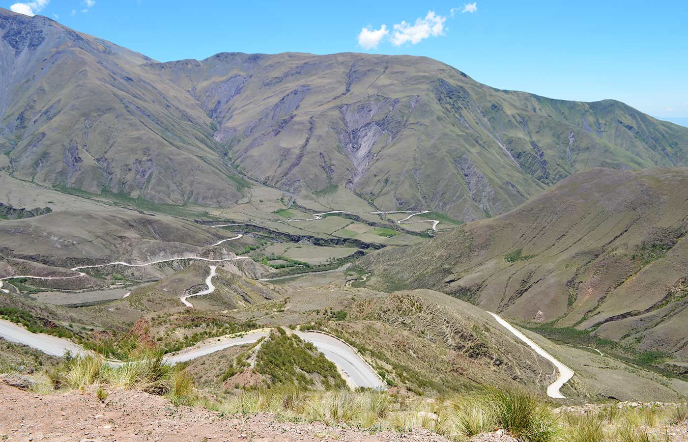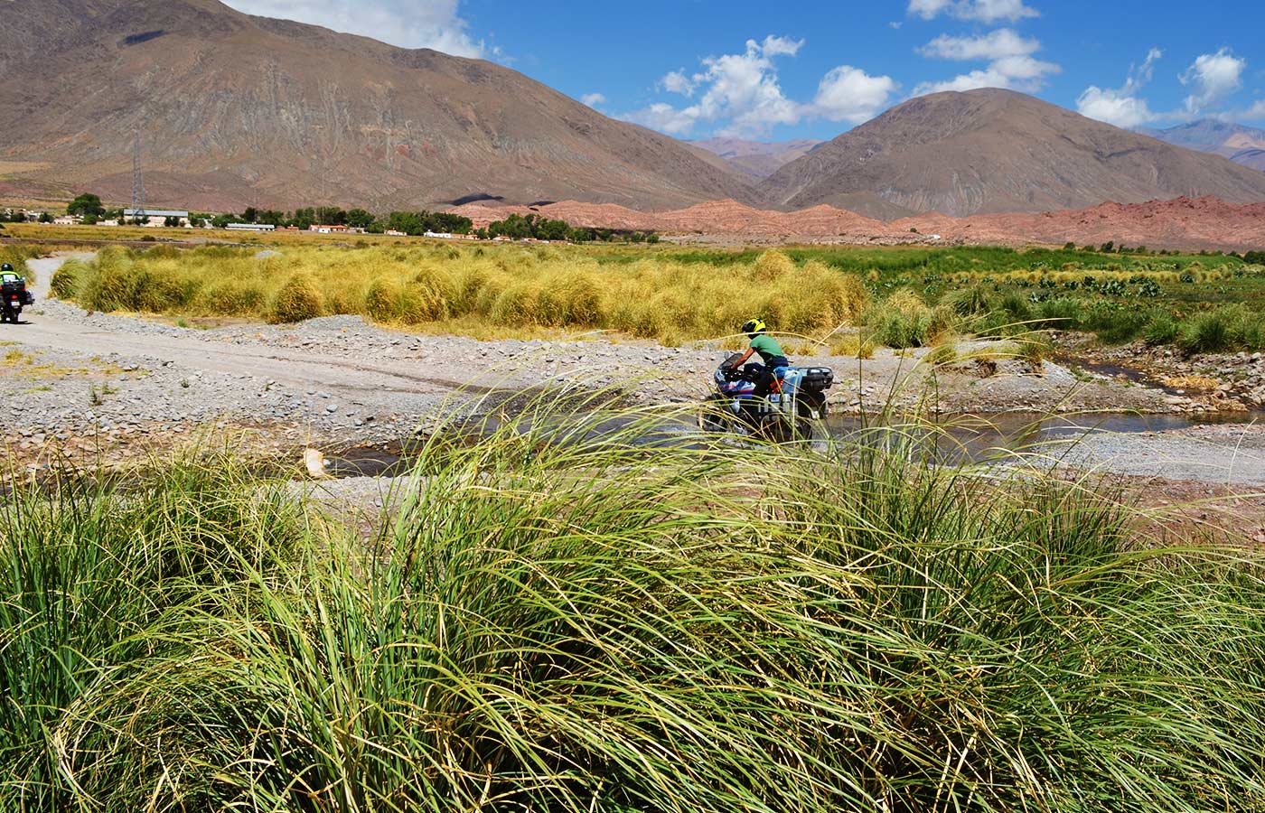 Towards midday we relax in a delightful restaurant and then continue. We soon realise that going back up the Andes the difficulties of the journey increase. Unfortunately we puncture a tyre: we go back to Cachi to repair the tyre and re-evaluate the road. The following morning after a small ford we reach La Poma, a small village nestled in the colourful Andes plain. Then the landscape become more dry and inhospitable, the ‘40’ starts going up, our breathing and the bikes’ carburation change. We come across a nice woman taking her lamas to the pastures, chewing coca leaves to cope with the altitude, and she asks us for money to be photographed.