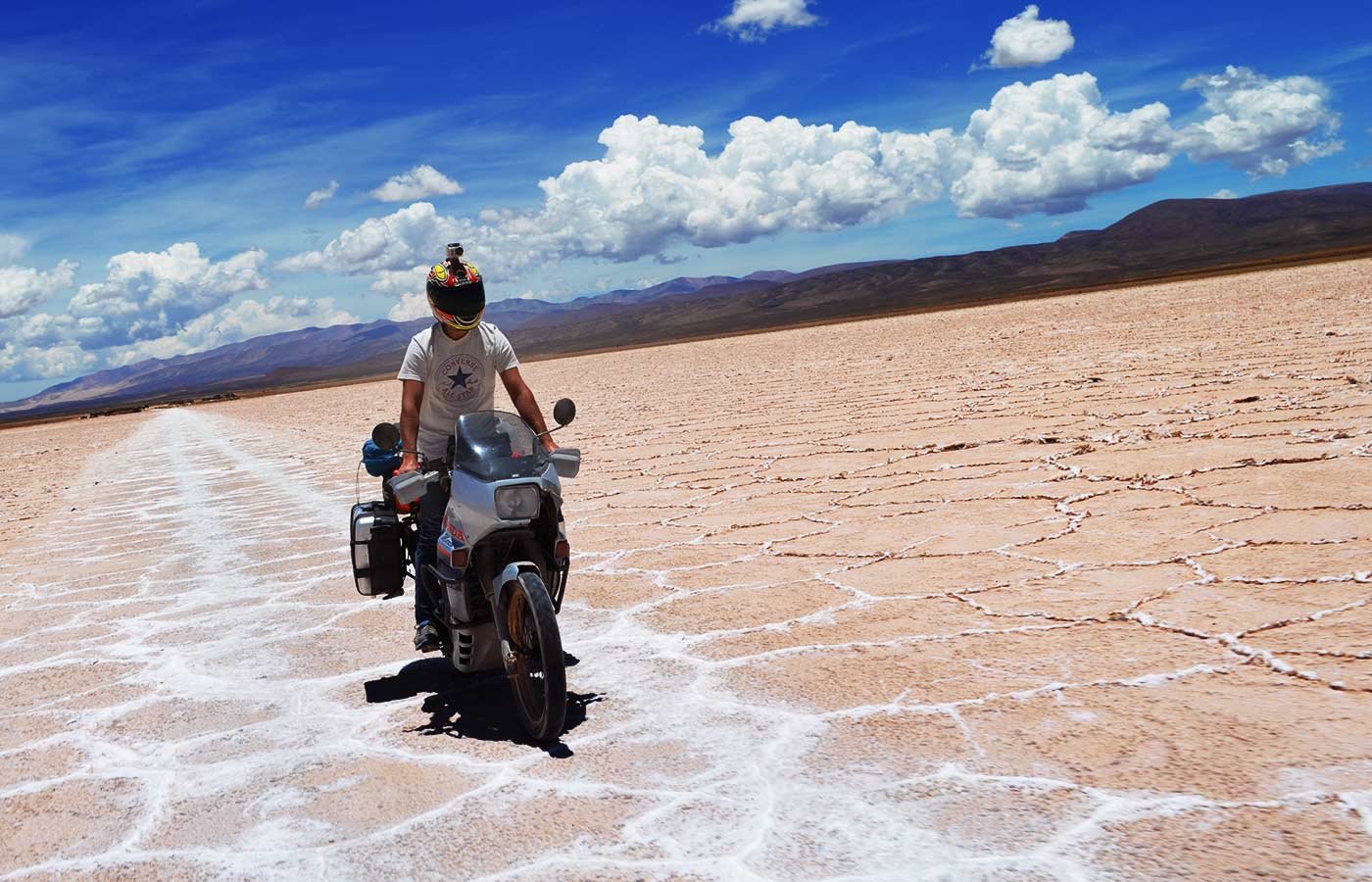 Then a new fantastic view: we leave the colours of the hills behind us, and in front of us we see unexpected white, blinding like snow. Slowly we approach this white majestic desert and we understand we are in front of Salinas Grandes. Perfect hexagons are painted like pictures. 10,000 years ago it was a freshwater lake, swampy and with abundant vegetation. Today it’s a huge body of salt studded with turquoise pools. We enter on our motorcycles loading on our saddle, instead of our luggage, the guide who will show us in detail the workings of nature and man. We resist the temptation of going really fast on this salty lake, in case some point collapses. We end our Argentinian leg of the trip on December 17 in San Salvador de Jujuy.