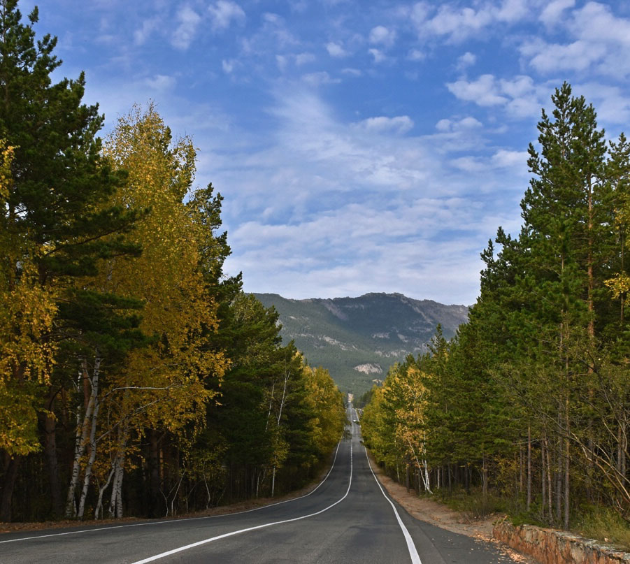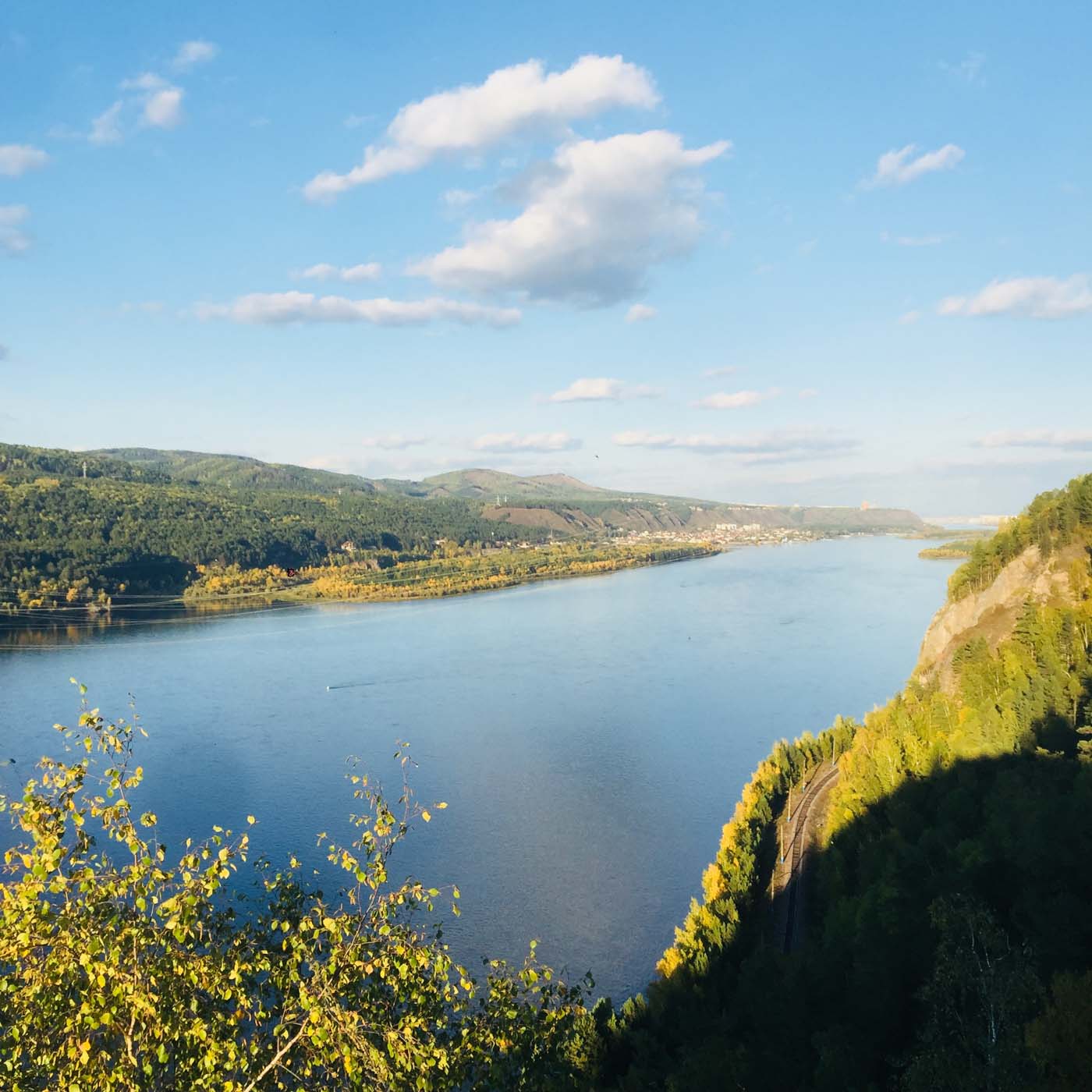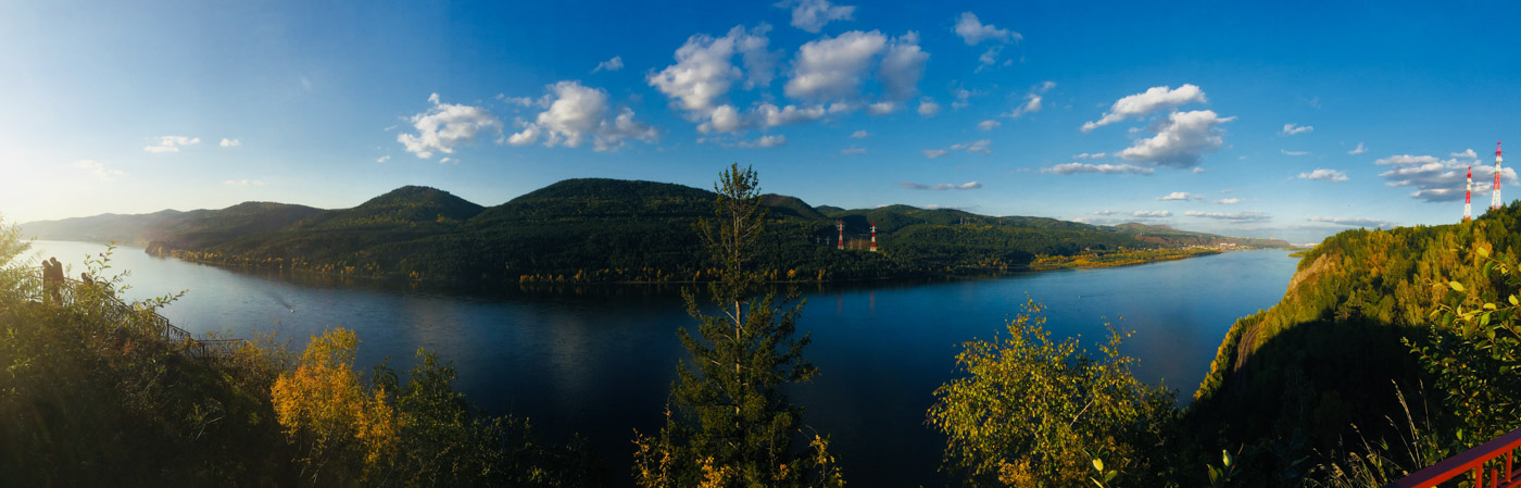 On my way to Krasnoyarsk, right after Achinsk, I took South through Divnogorsk. That road became the most exciting road in my whole journey! I had everything: beautiful mountains, delicate scenery which was even more catching as autumn was there. I have always liked serpentines. I feel like motorbikes were created only for them! Before I had entered Krasnoyarsk I decided to climb up to a view point which would open a scenery of the whole big Siberian river Yenisei. Its length is 3500km.