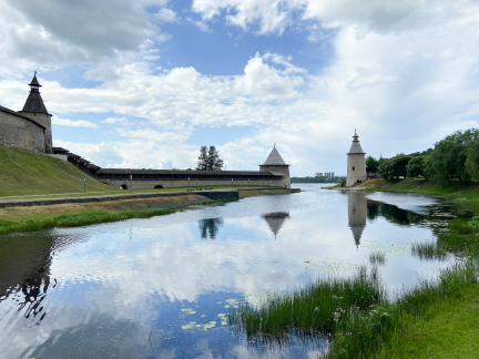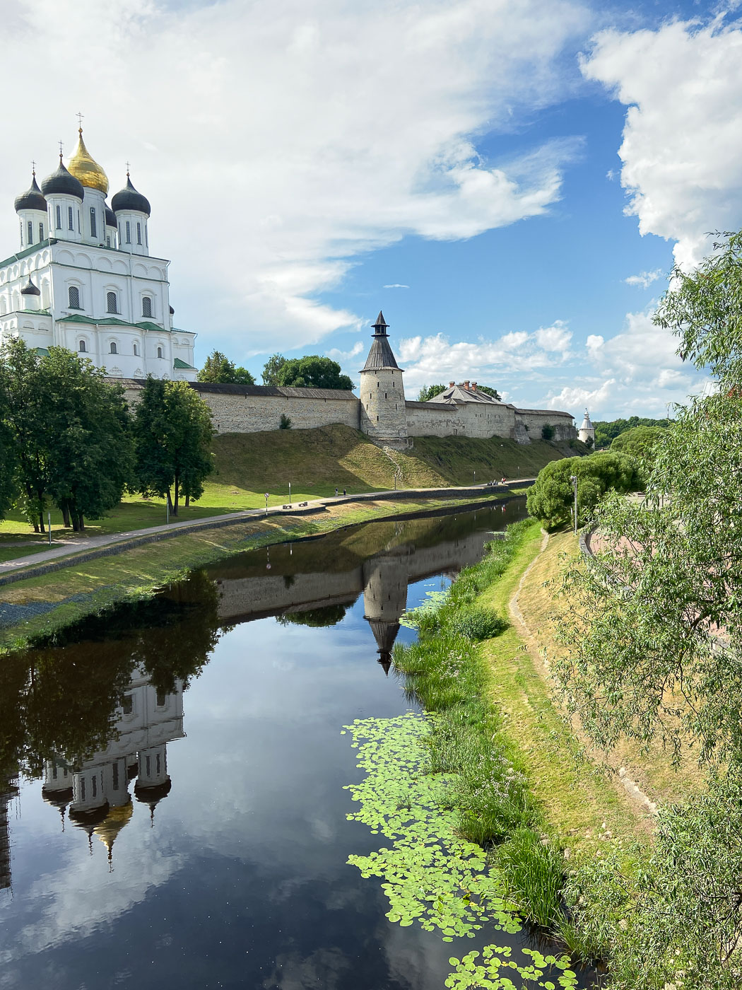 I dedicated this day to Pskov. I reached it very quickly – it is only 40 kilometers along a beautiful road. Leaving the motorcycle in the parking lot and changing into sneakers and shorts, I decided to walk around Pskov all day and learn more about its history. Pskov is a city in west Russia, near Estonia. It’s known for the Pskov Krom, a citadel whose fortress and Holy Trinity Cathedral date from medieval times. Pskov is one of the oldest cities in Russia. Its earliest mention comes in 903, which records that Igor of Kiev married a local lady from village Vybuty, Olga, afterwards known as St. Olga. Pskovians sometimes take this year as the city’s foundation date, and in 2003 a great jubilee took place to celebrate Pskov’s 1,100th anniversary. Pskov still preserves much of its medieval walls, built from the 13th century on. Its medieval citadel is called either the Krom or the Kremlin. Within its walls rises the 256-foot-tall (78 m) Trinity Cathedral, founded in 1138 and rebuilt in the 1690s.
